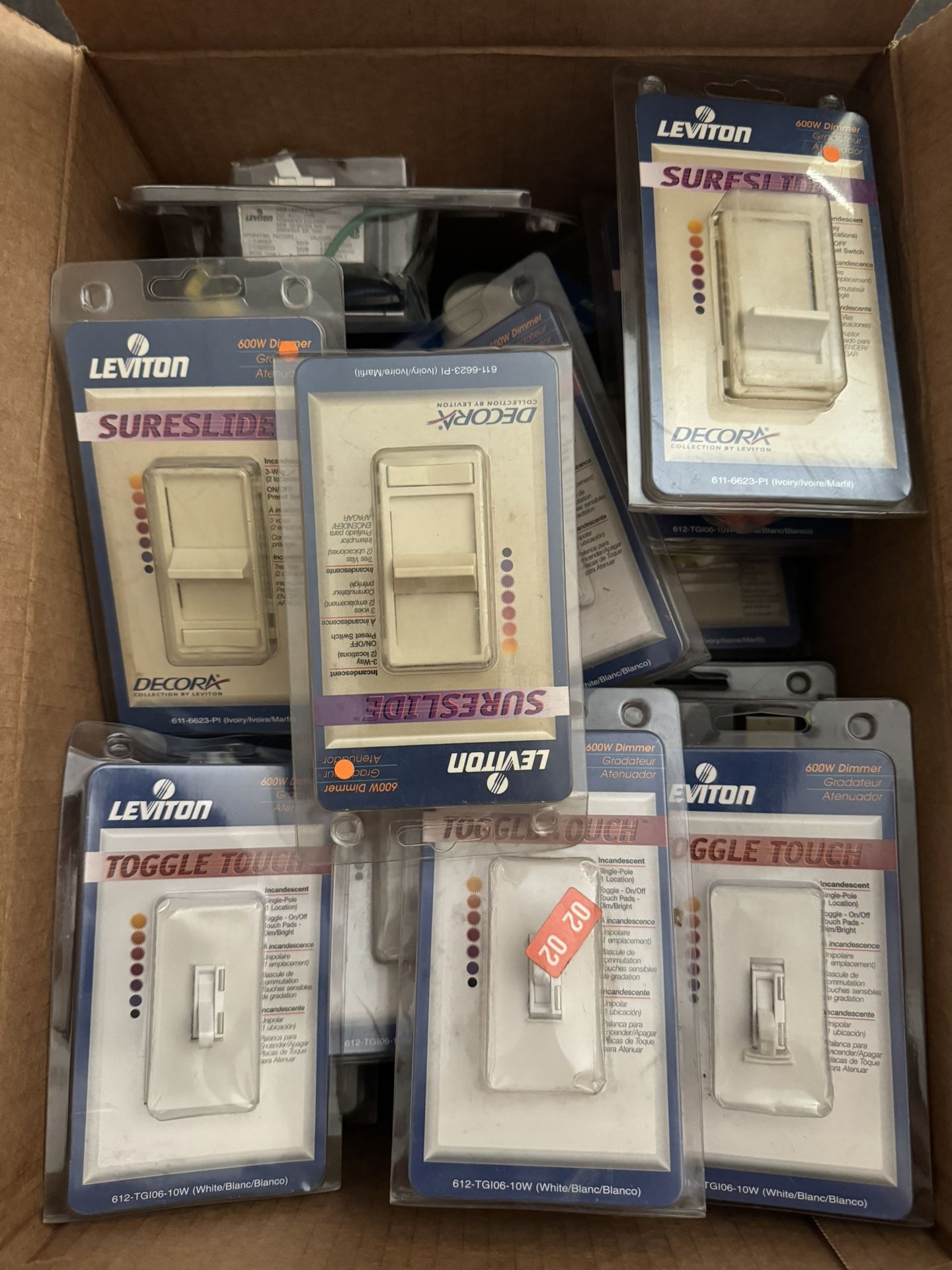 Lot of 36 Leviton Light Switches/Dimmers and Outlets. All the devices are left overs from an electrical business. The blister packaging for most are moderately crushed/dented, show shelf life and some packages have yellowed. All of the devices appear to be new (wires do not appear to have been spliced/connected). You will receive the following devices: 7 : 612-TG106-10W 1 : 601-TG106-1LI 1 : 602-MDM06-1LW 2 : 602-TT206-10W 1 : 5678 1 : 6633-PI 5 : (contact info removed)-AA 6 : (contact info removed)-AI 3 : 611-6623-PI 1 : 6631-IWP 1 : 6631-LI 1 : 6631-WWP 1 : 12650-I 1 : 700-W (Open Package) 1 : 6621-W (Open Package) 1 : 6633-PLA (Open Package) 2 : Outlets (no model #) All for only $185 or best offer. If you see this ad, then they are still available. Local, cash only transaction. Thank you for stopping by and taking a look!