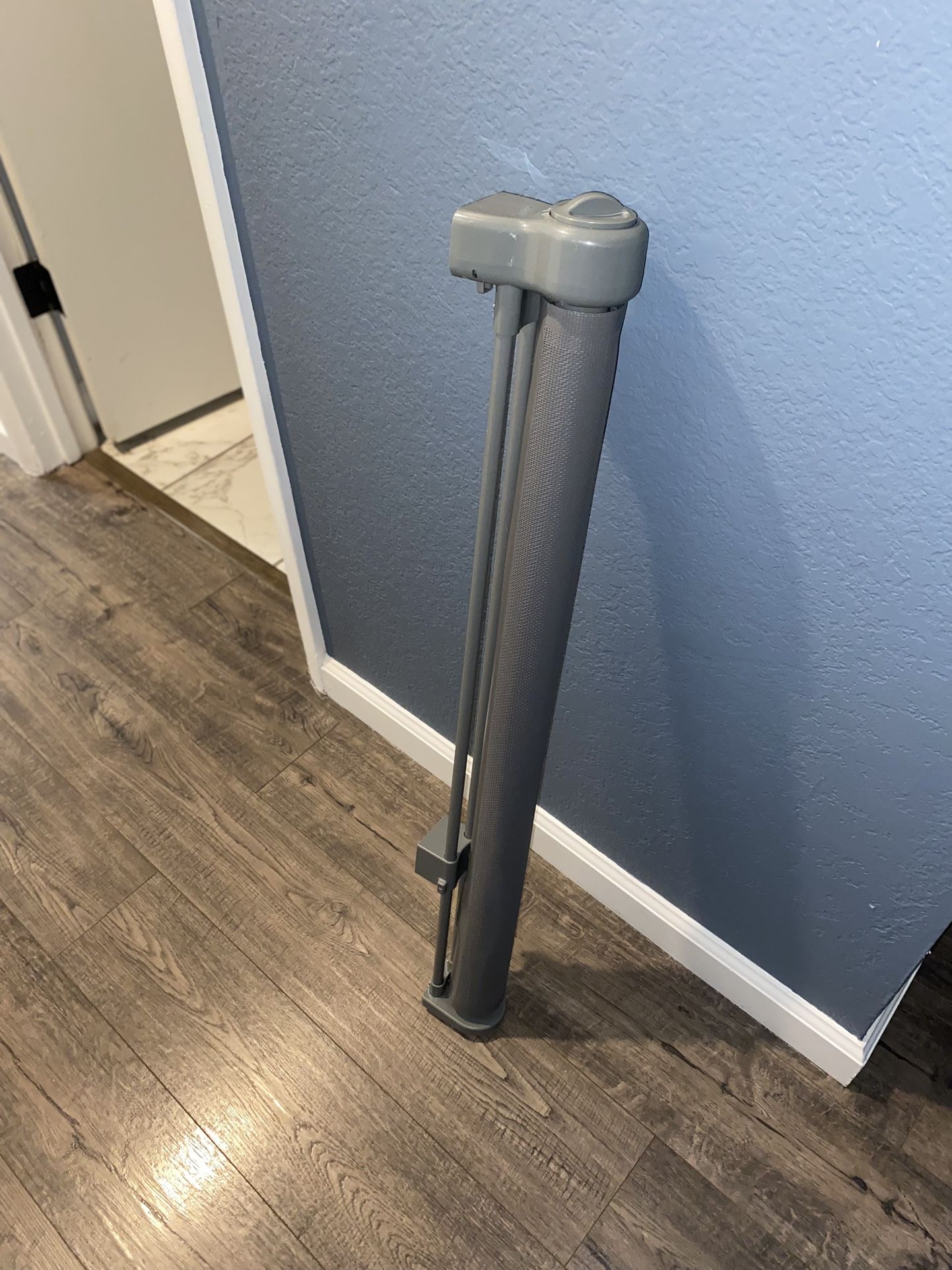 -Pet or baby safety gate -Color: gray -Hardware was screwed into wall, decided not to use this type of gate - it’s like new -Dimensions: extends up to 165 inches