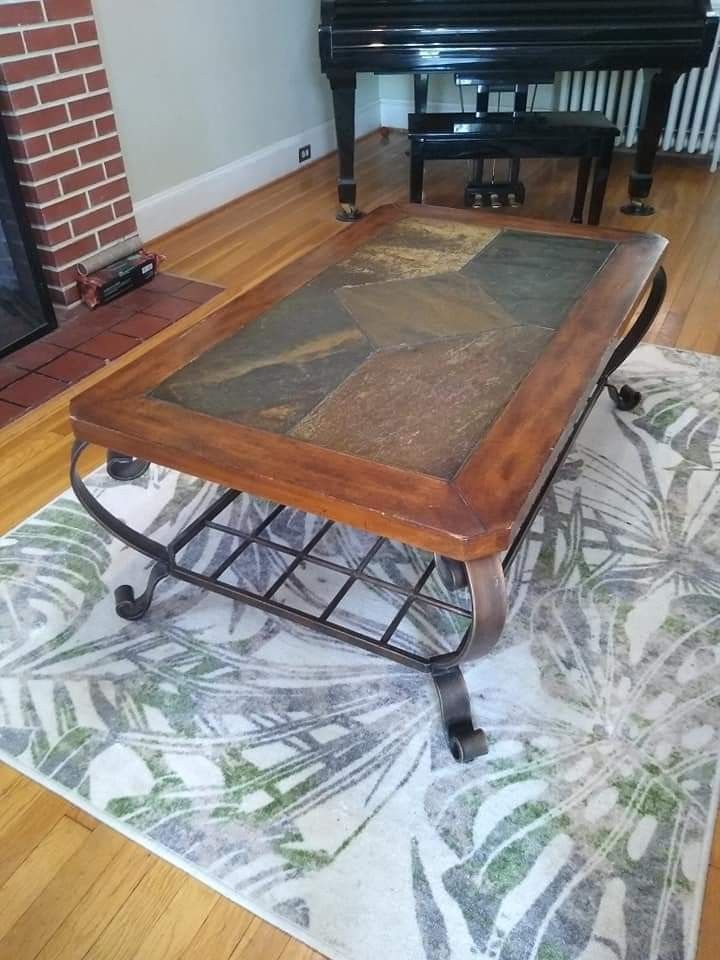Approximately 3 by 5 iron, wood, and stone coffee table. 4th photo shows type and value.
