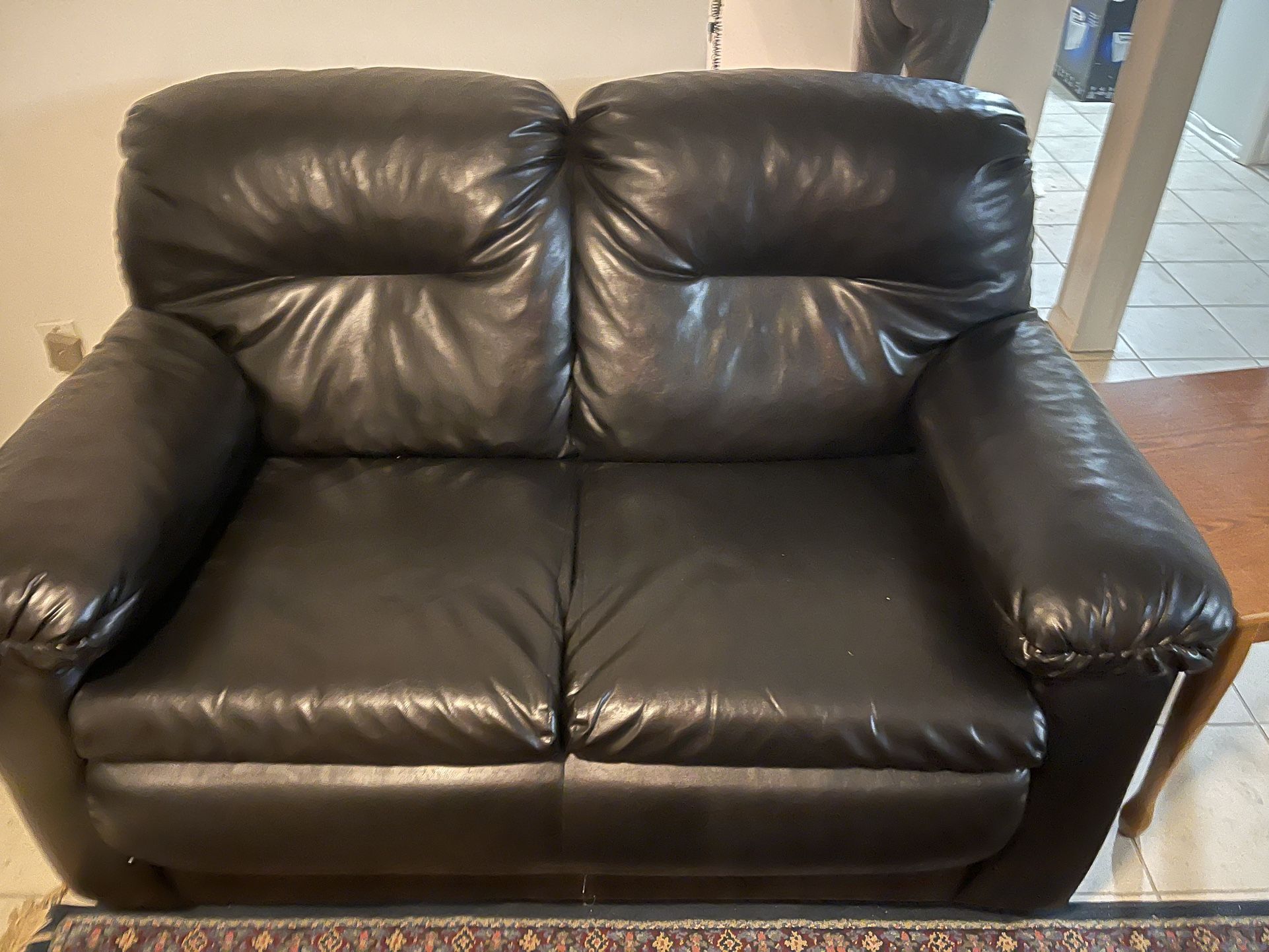 Moderately used black couches. Made with leather, very soft and comfortable.
