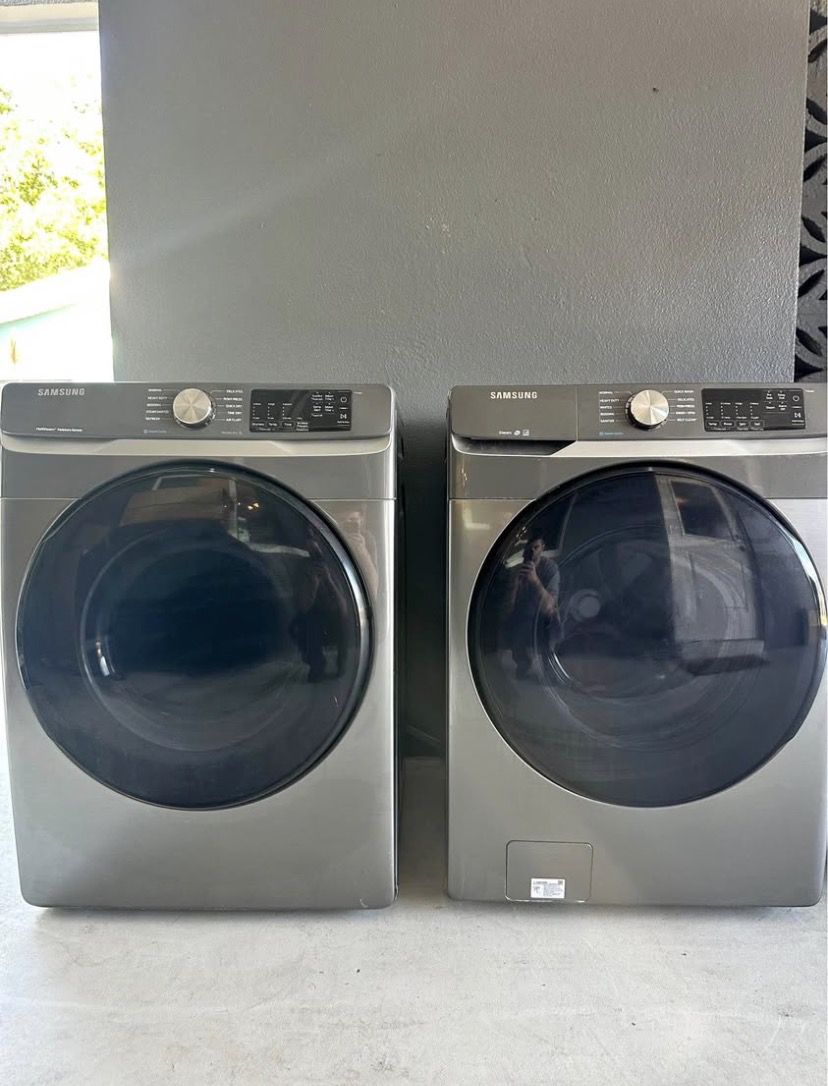 Samsung front-load washer and dryer set in great working condition. • Large capacity • Washer: Self Clean, Sanitize, Quick Wash • Dryer: MultiSteam, Moisture Sensor, Wrinkle Prevent • Modern graphite finish • Clean stainless steel drum • Digital display controls