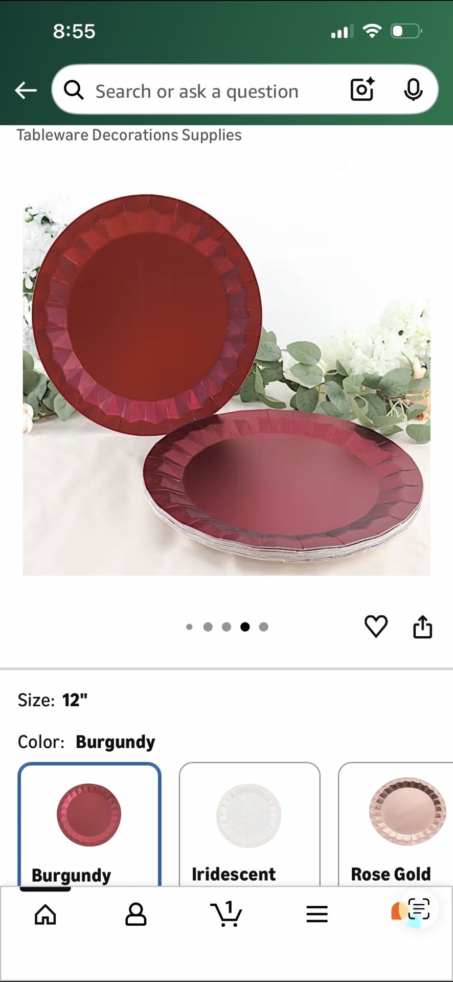 25 Pc 12” Round Burgundy Paper Plates. They are 12 inches big and 8.25 inches wide! There are 25 in a pack