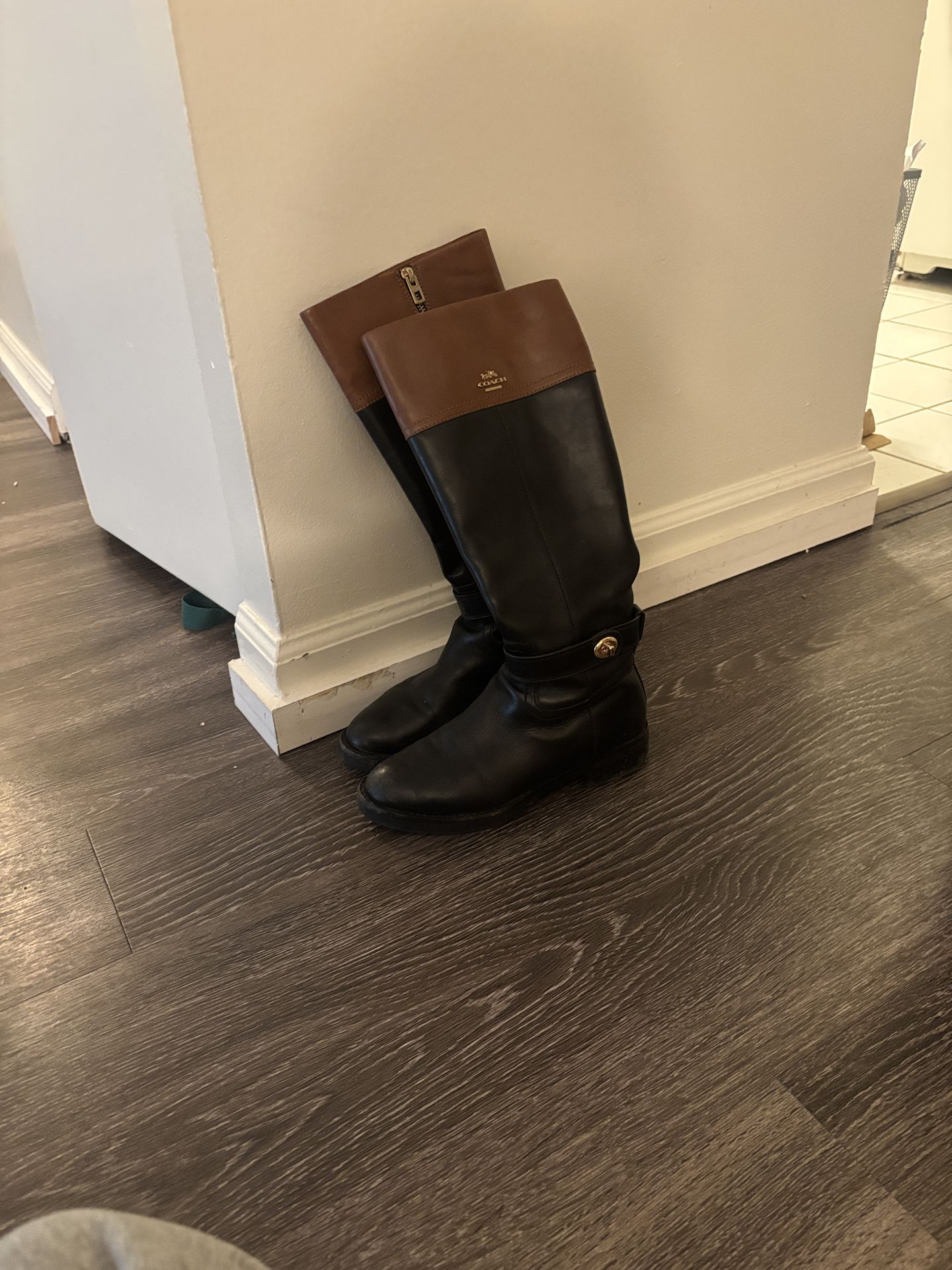 The Coach Black Brown Knee High Riding Boots are a stylish and versatile option. Made from leather with a round toe shape, they feature a logo button and zipper closure for added flair. Size US Women’s 6. Cash, PayPal goods & services, or Venmo goods & services only. Local pickup only. Pre-owned & in good condition. Will clean once more before selling.