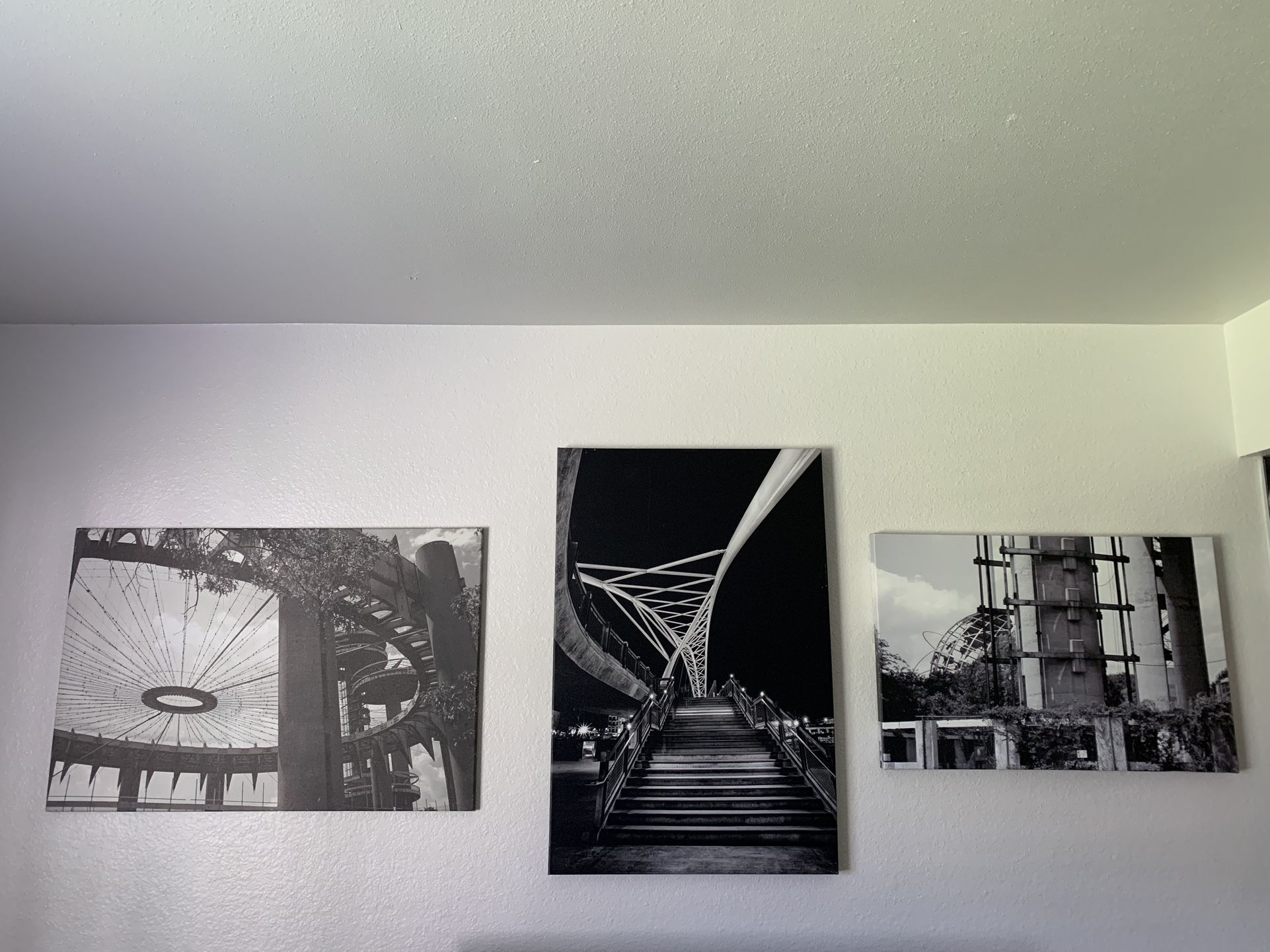 Black and White photographs on canvas. Have had them for a while but they wont be making my next move. Some wear-and-tear (see photo) but overall, pretty cool pieces for an apartment or office room. (All 3 for $25–willing to negotiate price for individual photos). Dimensions: 1.5” x 20” x 30” 1.5” x 24” x 36” 0.75” x 36” x 24”