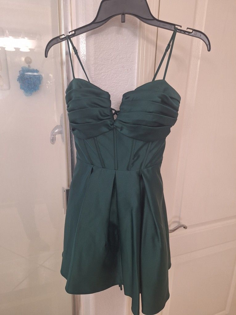 I17 and jomax Dresses show sizes. They are small size 3. Periwinkle purple and the white one are floor length with leg slits. Forest green is above knee corset tie back. All worn once. Been in dress bag storage in closet. $25 Each cash