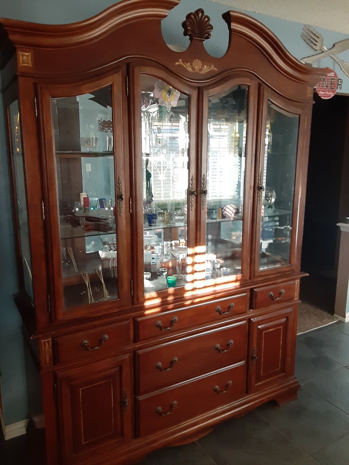 Large wood china cabinet with mother of pearl inlay designs. All drawers are in good working condition and the interior lights work as well. $350 o.b.o.