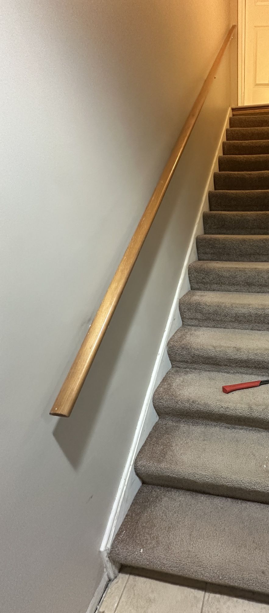 Rounded solid wood handrail. Length 14’-1”. Comes with 4 brackets and hardware. Great Condition.
