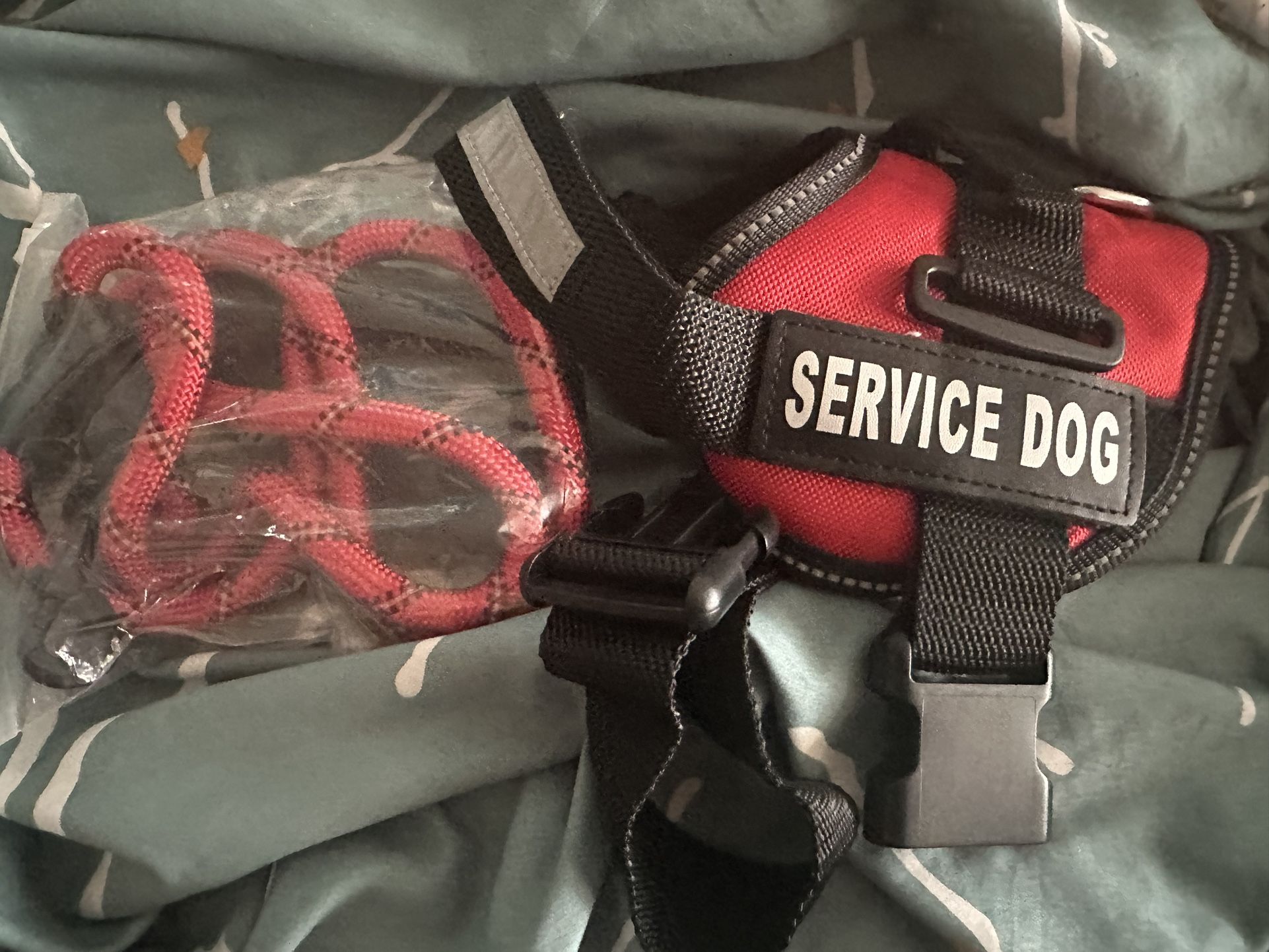 Brand new. Size small service animal vest. Tried it on him once it was too big missed the return date on Amazon.