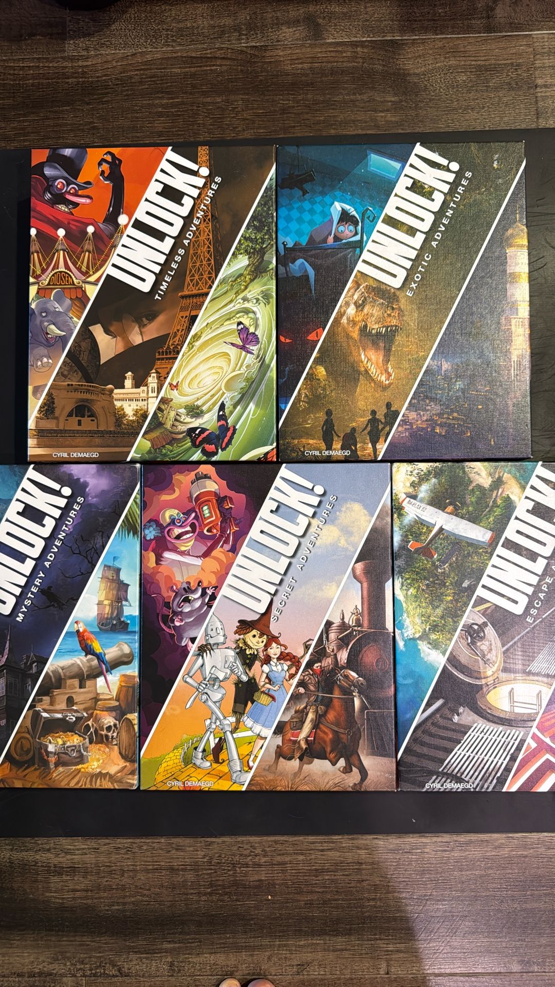 5 boxes of Unlock! Adventures. 3 sets of escape room-like adventures in each box. - Timeless Adventures - Exotic Adventures - Mystery Adventures - Secret Adventures - Escape Adventures Each box has been played only one time, so the cards and accessories inside are in like-new condition. $15 each or $70 for all 5.