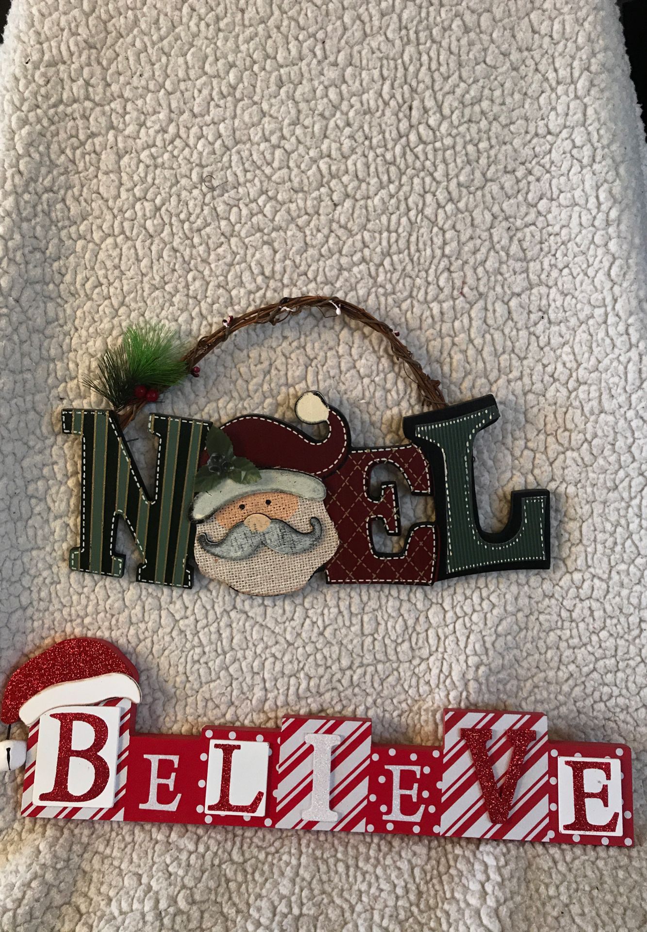 Selling these 2 holiday hanging signs. They are both new and never used to decorate. The red and white wood “Believe” stands alone or could attach a hanger and hang on wall. It is about 15 inches long . Santa ‘s hat has a white bell hanging from it. The “Noel “ sign is about 13 inches wide and letters about 5 inches tall. It hangs by a thin grapevine type string. Both are new, no marks and come pet and smoke free home. Asking only $5.00 cash for each .