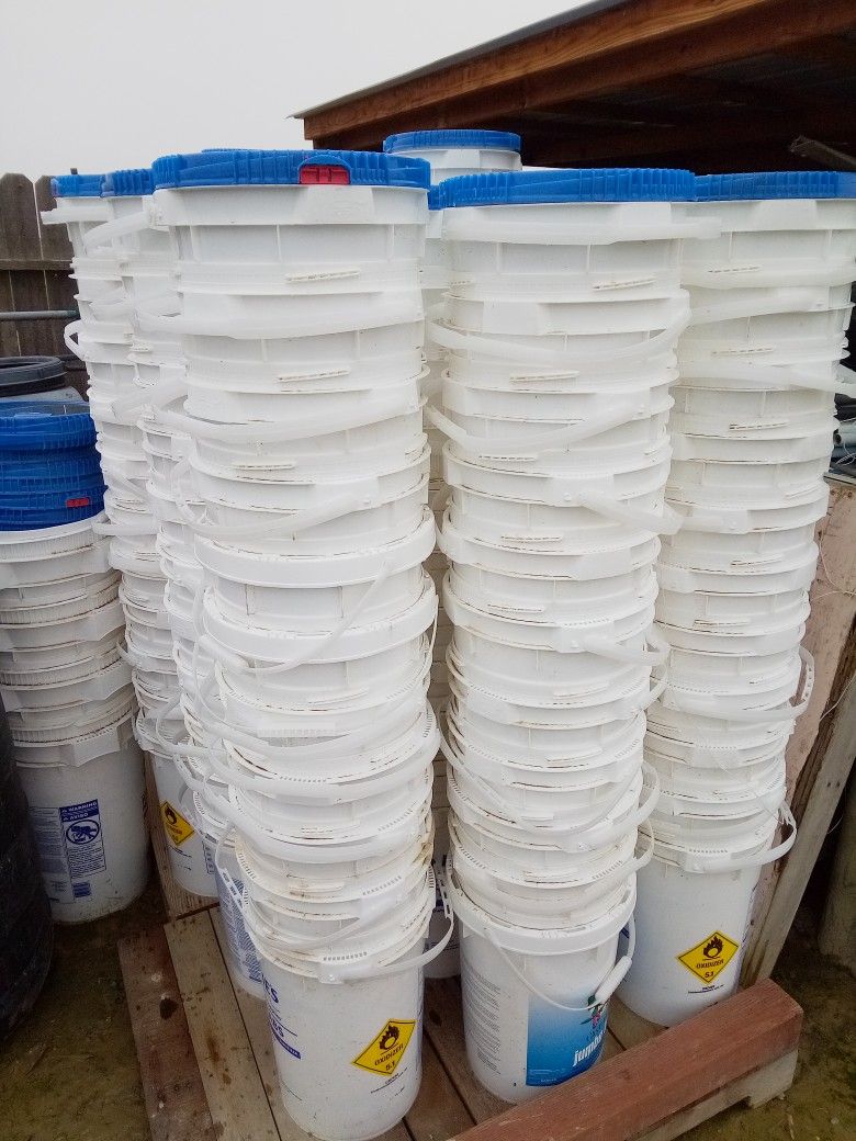 *Please reply with a pick up date and time. Tall 6.5 gallon plastic buckets with lids and handles. Non-food grade. Can be used for holding general storage, like tools. Plenty in stock. -Price $5 each. Or buy 10 at $3 each. -Pick up in Delano, CA