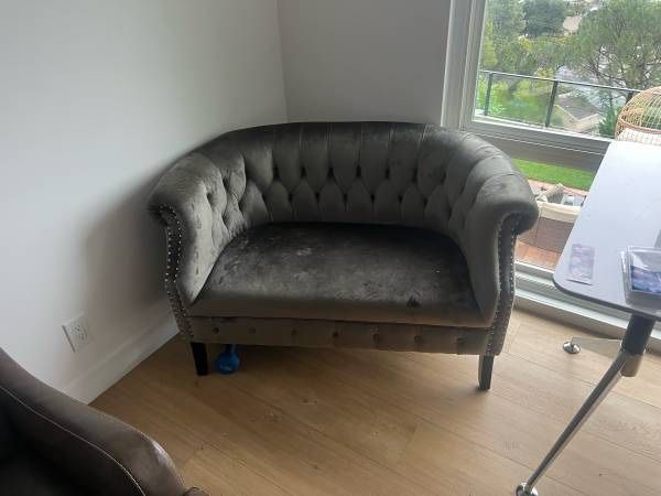 Tufted Velvet Loveseat Gray Nailhead Trim $100 Originally purchased for $400 Modern curved design with tufted back and seat Nailhead trim detail on the arms Soft velvet or velvet like fabric Perfect size for apartment or office Measurements Approximately 60 inches wide Approximately 40 inches deep Condition Great condition Clean and well cared for No rips or damage $100 Price is firm Pickup only If interested hit me up