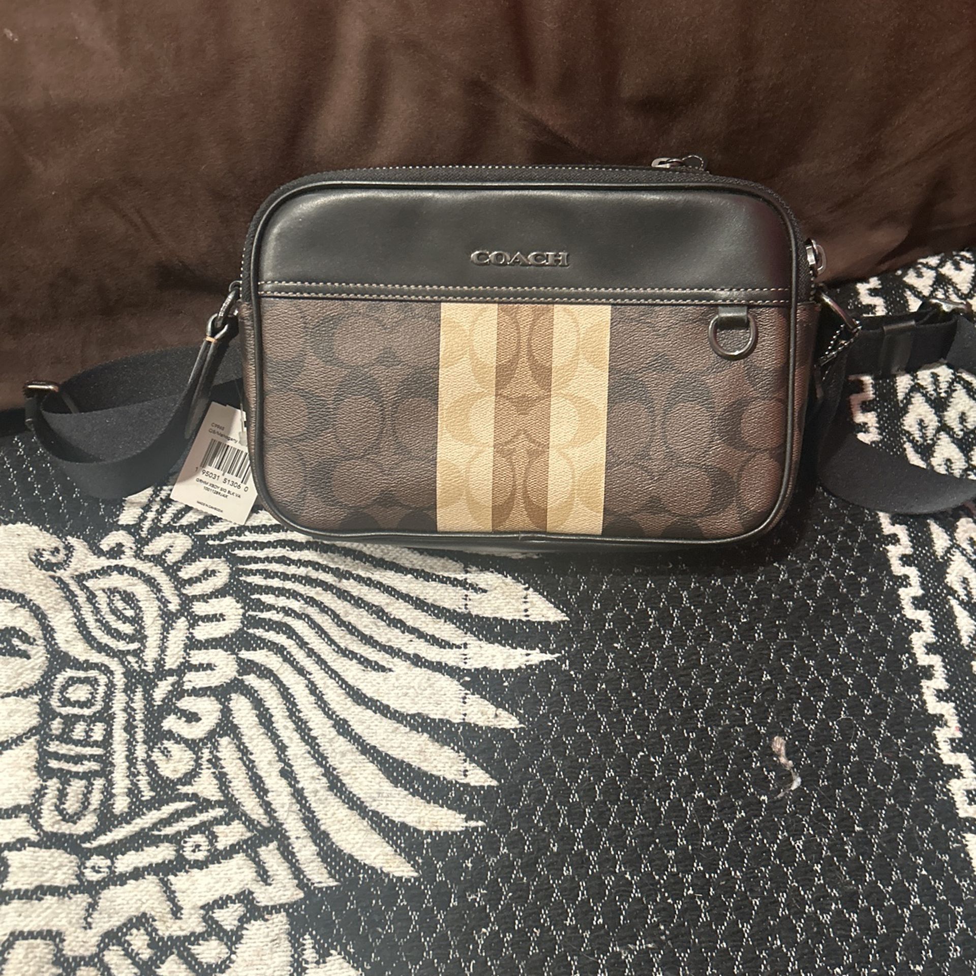 Signature coated canvas and refined calf leather Inside multifunction pockets Double zip closure, fabric lining Outside slip pocket Adjustable strap with 25" drop for shoulder or crossbody wear 9" (L) x 5 3/4" (H) x 2 3/4" (W) NEW & Authentic