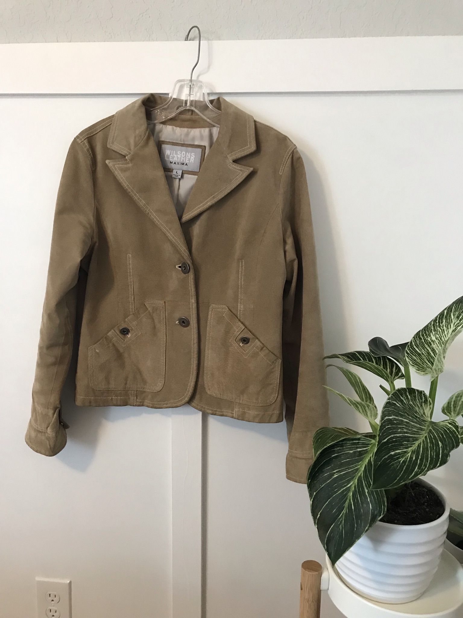 Pre/owned light tan brown suede leather color jacket for women. - Size L - Brand Wilsons, MAXIMA - Measurements: - Shoulder to hem: 20" - Armpit to armpit: 20" - Sleeve: 21.5" This jacket is located in Weston FL in a pet/Smoke free house. Asking price $45 cash and pick up only