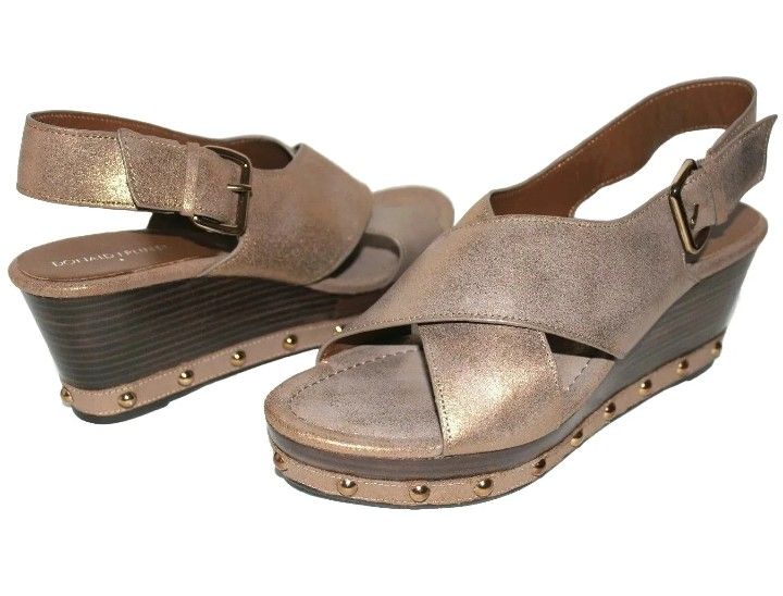 DONALD J. PLINER "Febe" Bronze Sling-Back Wedge size 10 US Medium Premium leather, metallic bronze hue, copper hardware, buckle closure with elastic goring for adjustable sling-back strap, crisscross straps, open-toe, leather lining and comfort-cushioned footbed, 2.5" stacked wedge and 1" platform, studded leather mid-sole trim, signature rubber traction lightweight sole. New without Box! 100% AUTHENTIC Smoke and pet free environment. Contact me if you have any questions. THANK YOU:-)