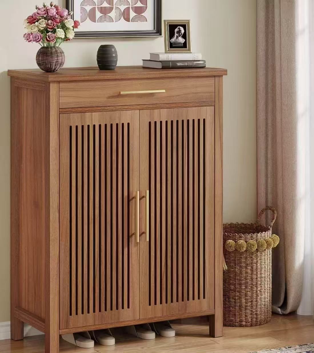 New Assembled Shoe Cabinet, 5-Tier Shoe Storage Cabinet with Louvered Doors and Drawer, Freestanding Wooden Shoe Rack Organizer with Adjustable Shelve