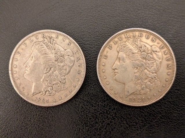 (2) Morgan Silver Dollars dated 1884 O and 1921. Price is for BOTH! 2 silver coins. Only $35 each! Original authentic. See my other items available.