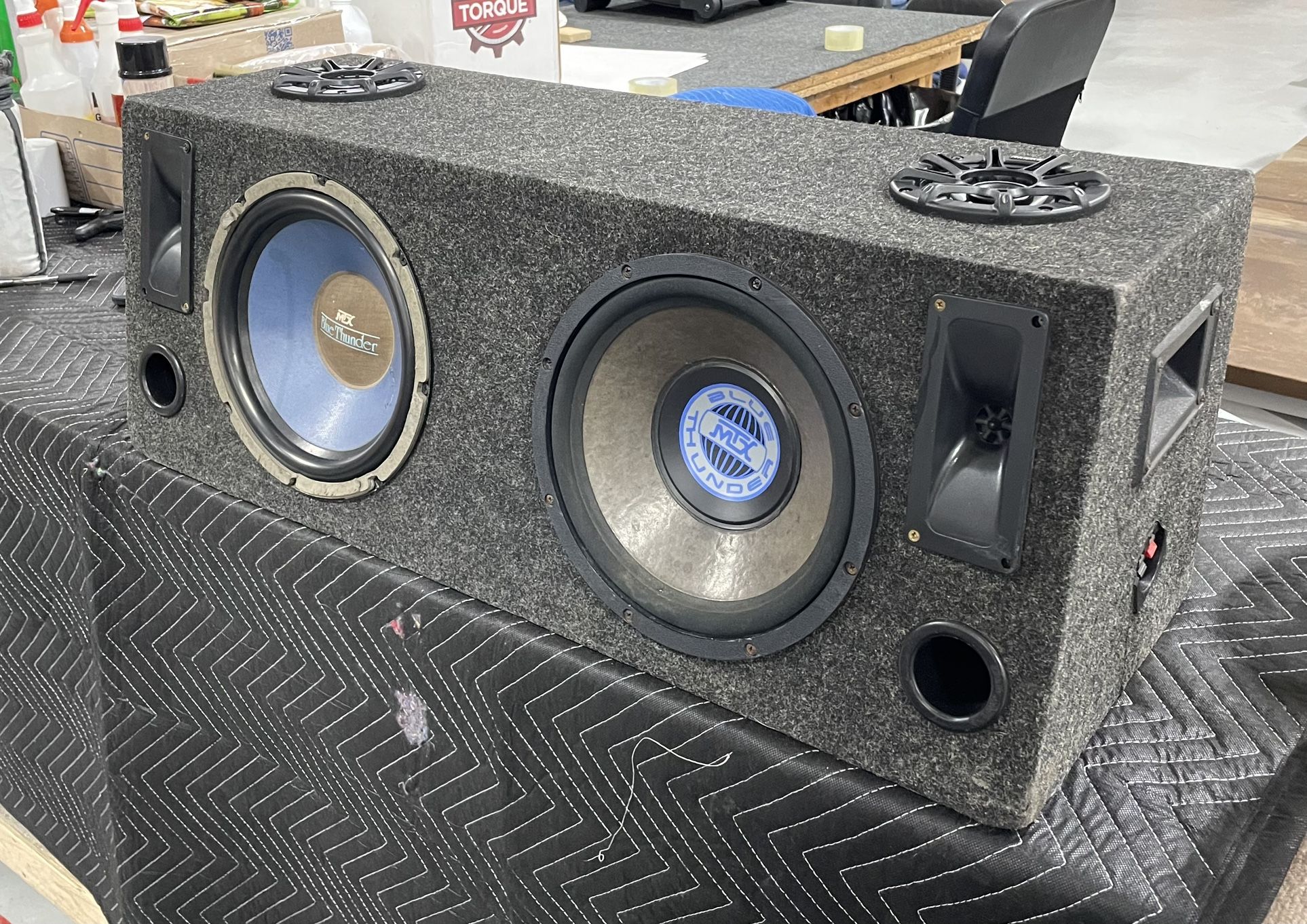 Sub box with speakers 2 10 inch MTX speakers 2 5 inch kickers Box measures H12L33D12 inches Can help load , damage to one of speakers see photos!
