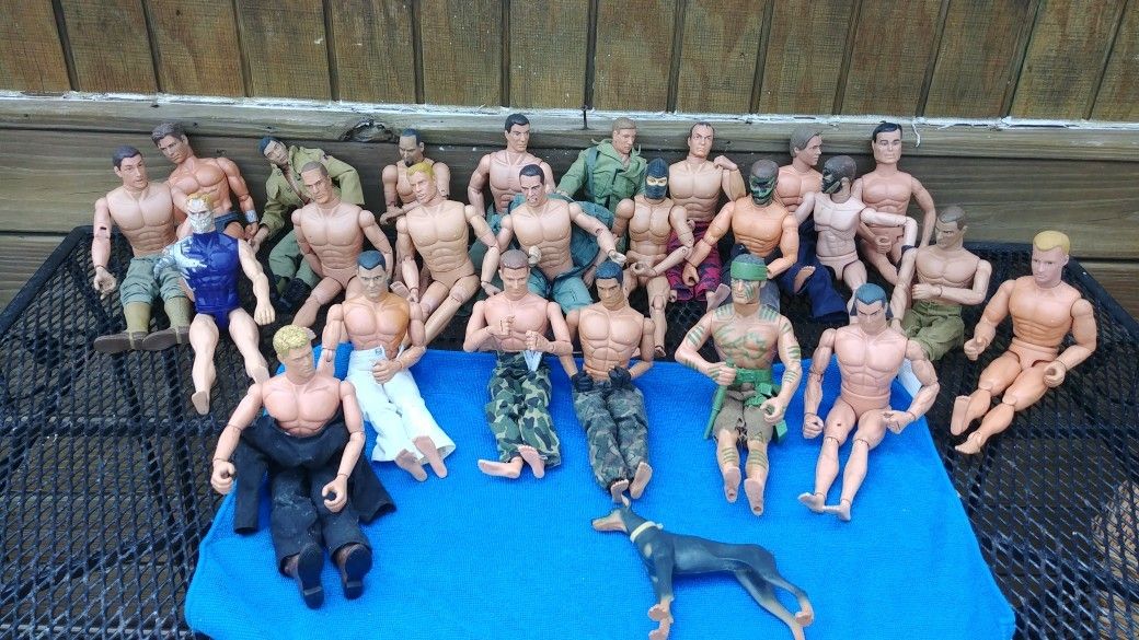 Huge lot of 12 inch action figures, uniforms, weapons and accessories. There are 25 figures in all, 7 are GI Joes. There are Power Team, Formative, 21st Century Toys, etc. 5 of these are missing a hand or foot. ALL GI JOES ARE INTACT. Incredible amount of accessories. 2 hard plastic GI Joe storage trunks. Great find.