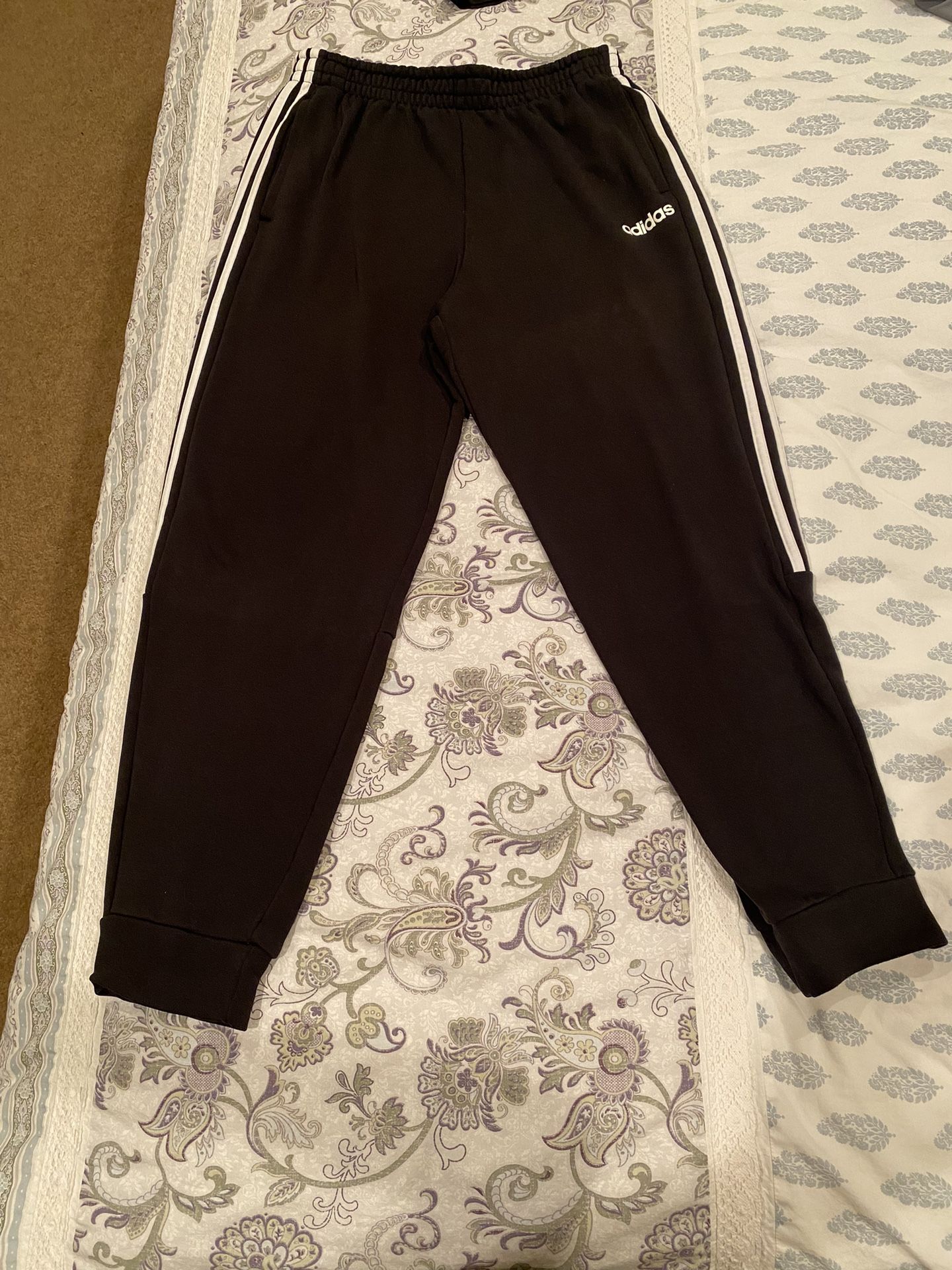 Size L Men pant are stretchable on the waist and ankles Color are black with white 3 stripes on side 2 pocket on each side This pant is used but I don’t wear them anymore still in good condition