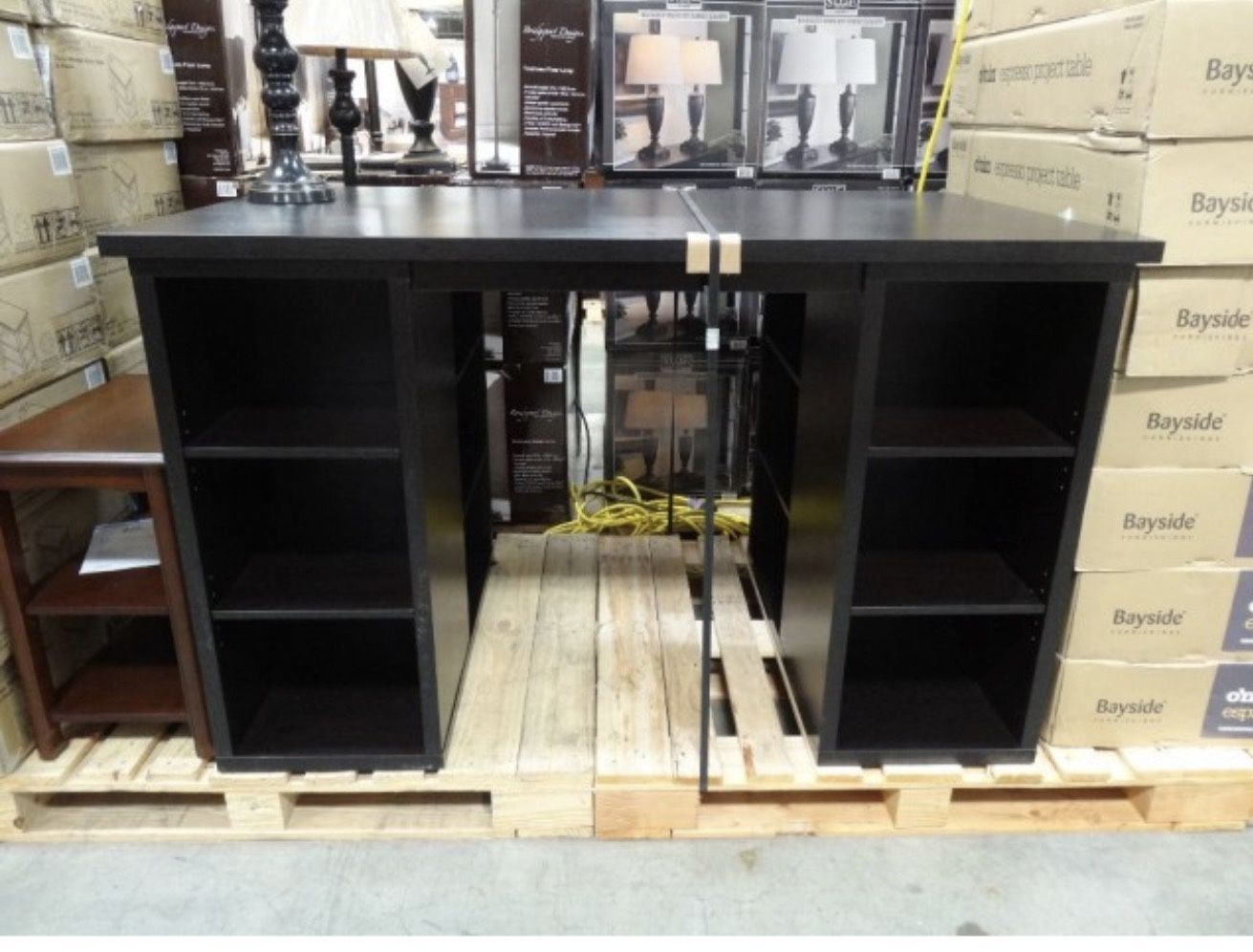 Project center table 60″ W x 35.8″ D x 37″ H Excellent condition It has wood construction with espresso melamine. The shelves are adjustable and provide flexible storage options. It is easy to assemble with the cam-lock and dowel system