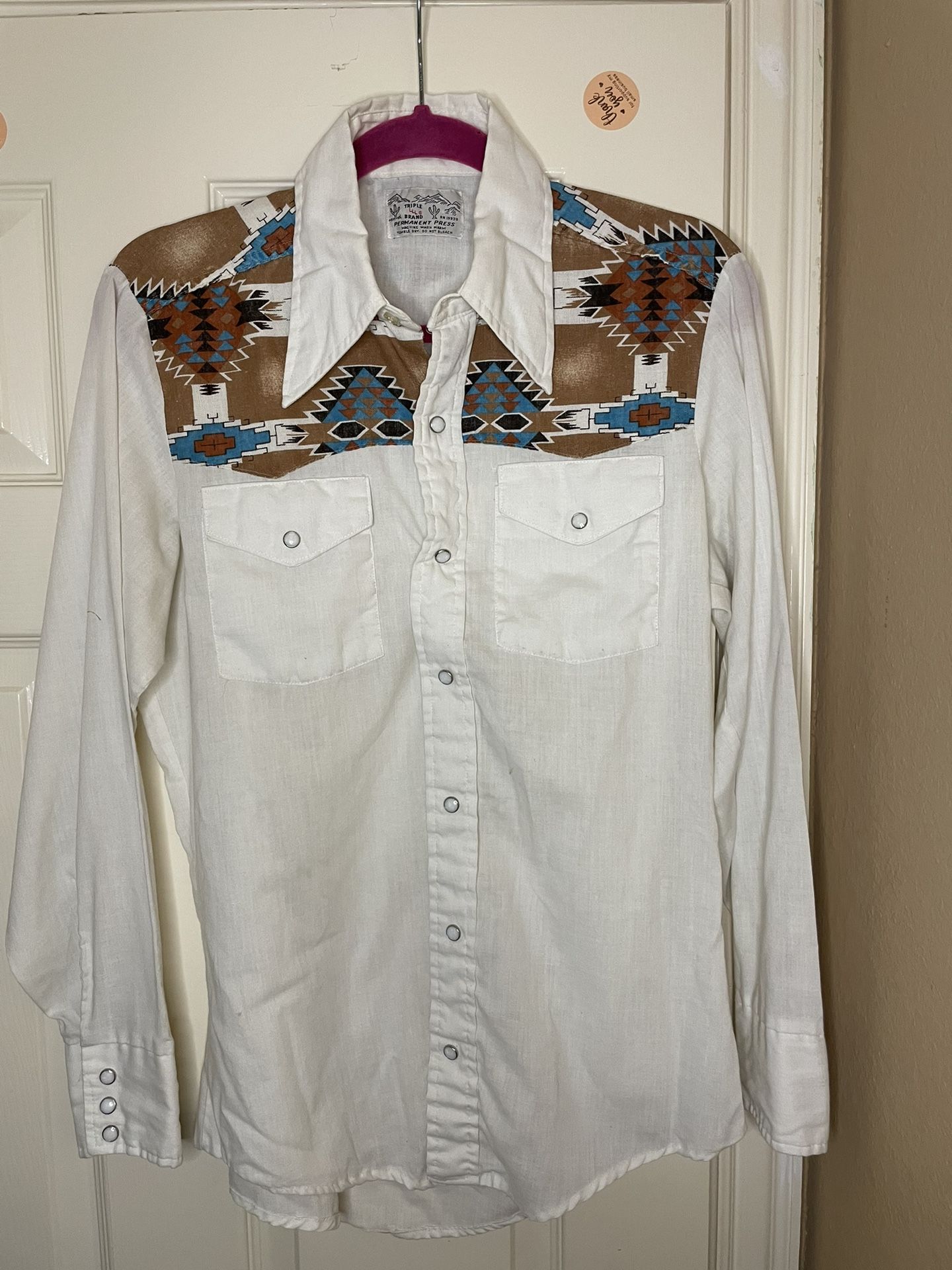 TRIPLE LLL BRAND western shirt Pearl Snaps TRIPLE LLL BRAND western shirt Pearl Snaps This is not white, it's more ivory, kind of a creamy color. Not yellow, but not as "white" as some of these pictures appear. Gauzy crinkle cotton/poly, with an southwestern look on upper chest. Snap front. Fits approximately, maybe small M, please compare the measurements below with a shirt you have at home that fits well. Overall great condition ... I see no major issues and is completely vintage and unique From "Triple LLL Brand" from the 1970's, comes to me from the original owner! Measurements laid flat Pit to cuff : 19" Pit to pit : 21" Length: 31"