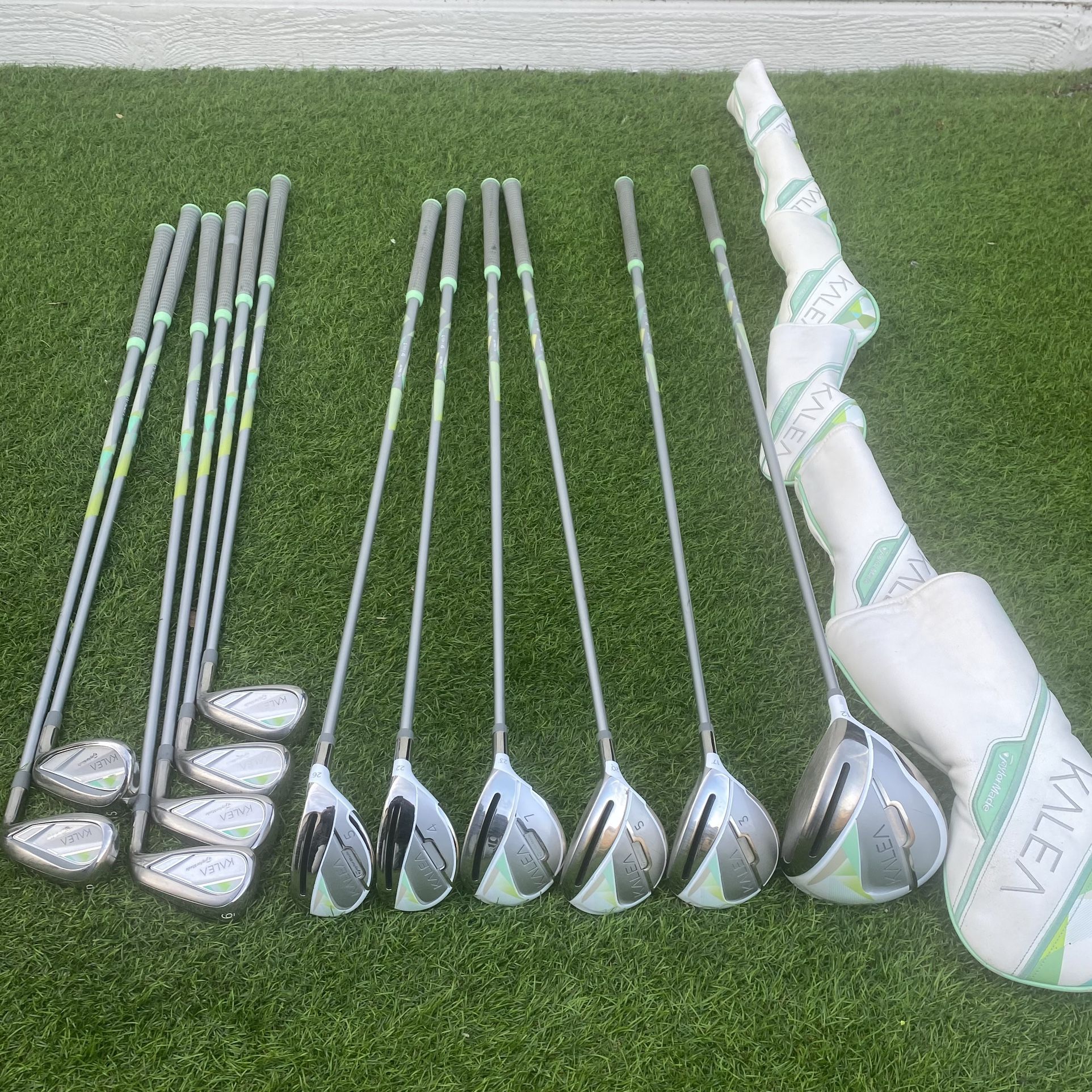 Excellent Condition Ladies Taylormade Kalea Golf Set Right Hand Graphite shaft 45grams Ladies Flex Grips are excellent Set includes 1 Driver 12with head cover 3 Fairway wood 17° with head cover 5 Fairway wood 20° with head cover 7 Fairway wood 25° with head cover 4 Hybrid 22° with head cover 5 Hybrid 26° with head cover 6 iron 7 iron 8 iron 9 iron Pitching Wedge Sand Wedge Pick up in Whittier Check out all my other golf items for Men’s Golf Women’s Golf Ladies Golf Junior Golf Jr. Golf Kids Golf Youth Golf Boys Golf Girls