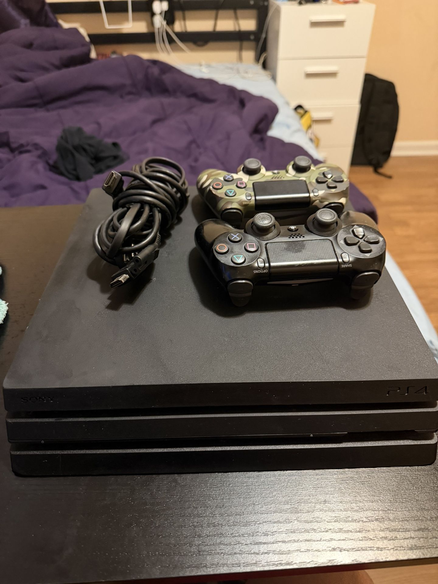 Used PS4 Pro in good working condition. Includes: • PS4 Pro console • 2 wireless controllers • HDMI cable • Power cord No performance issues. Normal cosmetic wear from use. System has been factory reset and is ready for a new owner. Local pickup preferred.