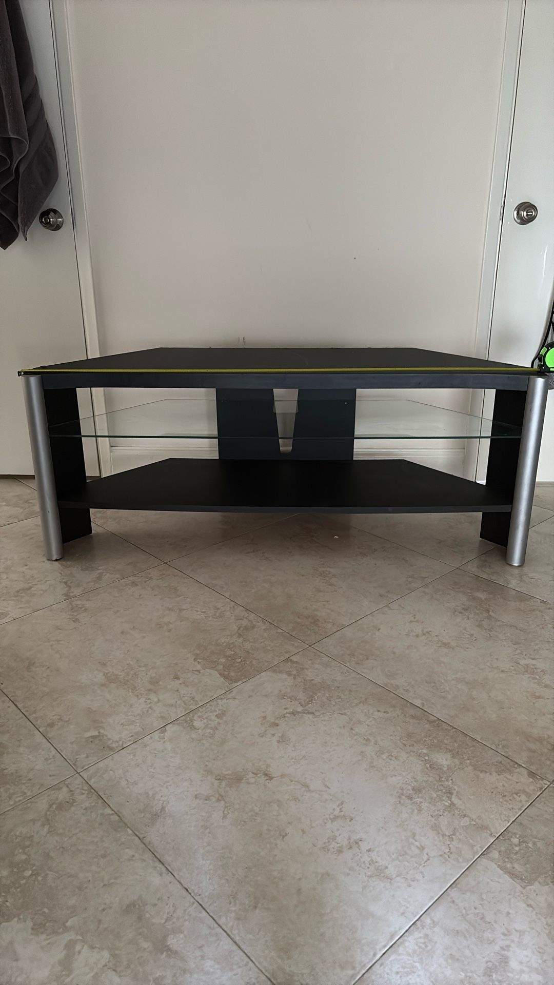 TV stand 2 shelves - middle shelf is glass Few scratches on the top from prior electronics.