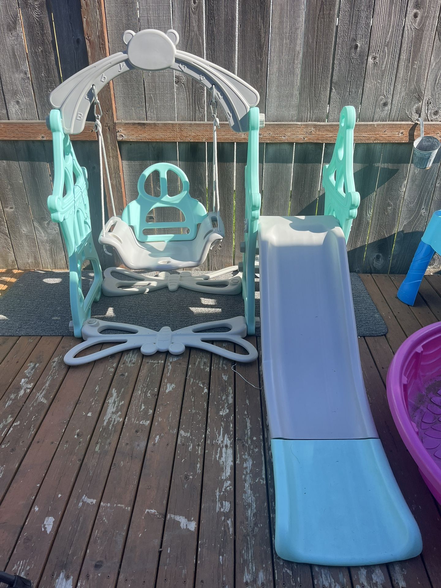 Swing and slide, my toddler just outgrew it, the swing has a piece for their legs to go through and secure them in, we just took it off for our kiddo to swing herself