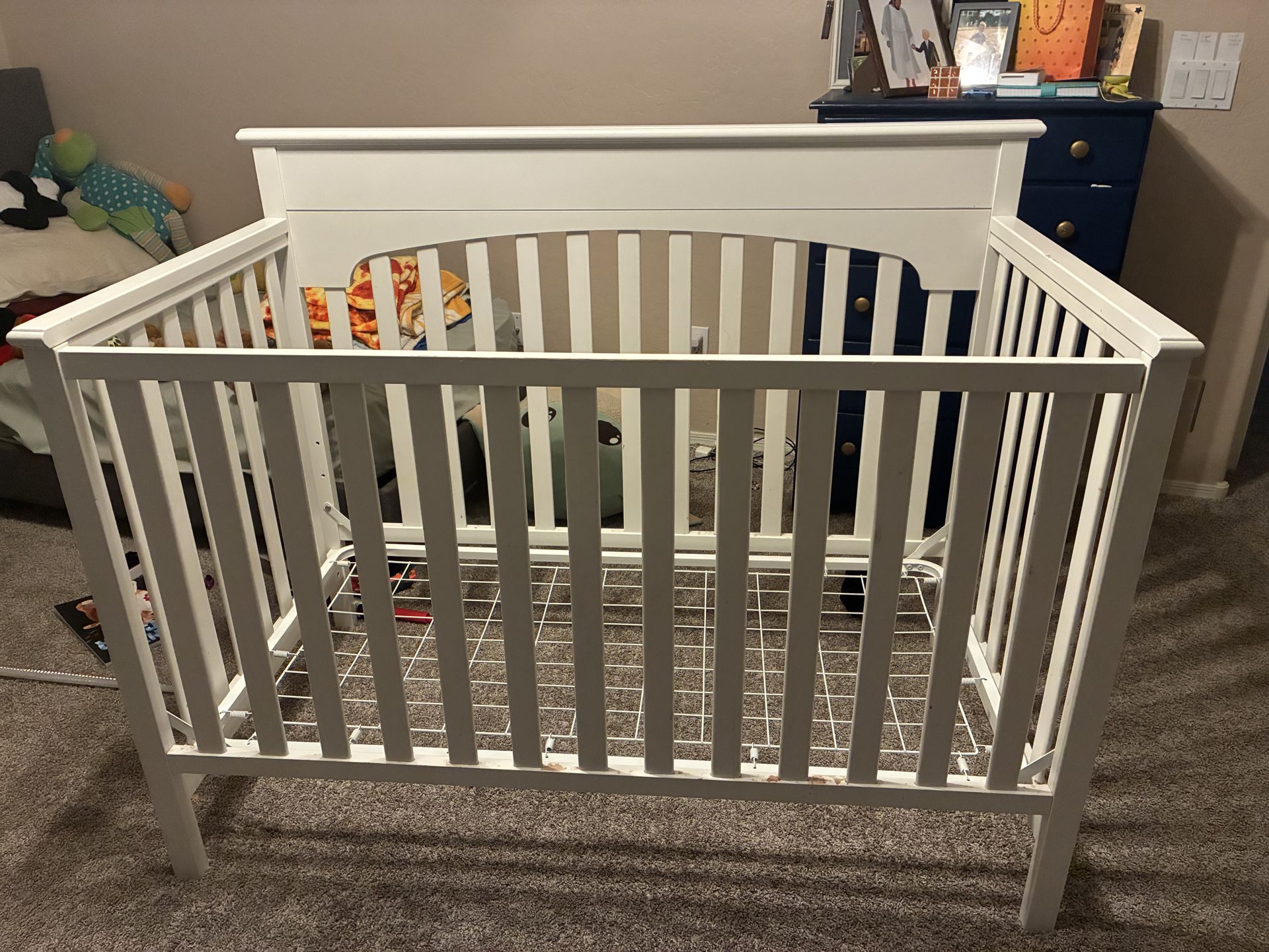 We are selling our white, wooden crib because our baby has moved to a twin bed. The crib is in great condition. We are a smoke-free and pet-free home. The crib has been disassembled for easy transport but this is what it looks like all set up. It’s perfect for a boy or a girl. A crib mattress is not included. (That should be purchased brand new since there are dust mites in used mattresses.) We hope this will work for your baby or grandbaby! Thanks for your interest!