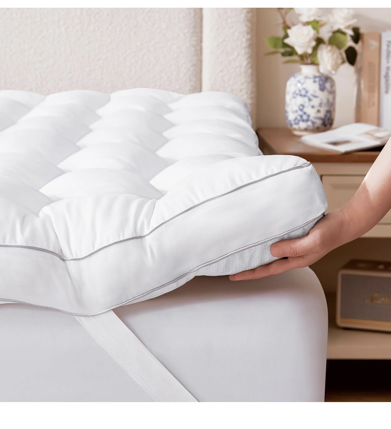 Brand new in the box 3 Inch Memory Foam Mattress Topper King Size for Back Pain Relief, Soft Fluffy Supportive Bed Mattress Pad, Filled with Breathable & Soft Memory Foam Pillow Topper, 80x78x3 Inch Color White Size King Fabric Type Polyester Special Feature Soft Closure Type Pull On Enhanced Comfort & Pain Relief – The 3-inch ergonomic design contours to your body, relieving pressure and pain. A blend of shredded memory foam and soft synthetic fibers provides cloud-like comfort, balanced support, and effective pressure relief for a more restful and relaxing sleep. Fluffy & Supportive – Made with 1700gsm high-density memory foam, this topper provides optimal support, enhanced pressure relief, and a breathable surface for a comfortable night’s sleep. Anti-Slip Design – The non-slip backing ensures added stability, while 4 sturdy anchor straps keep the topper securely in place, allowing you to enjoy uninterrupted sleep without frequent adjustments. Soft & Breathable – This 80" x 78" x 3" KING size mattress topper features a fiber-filled surface and memory foam core, with breathable fabric that promotes airflow and regulates temperature.