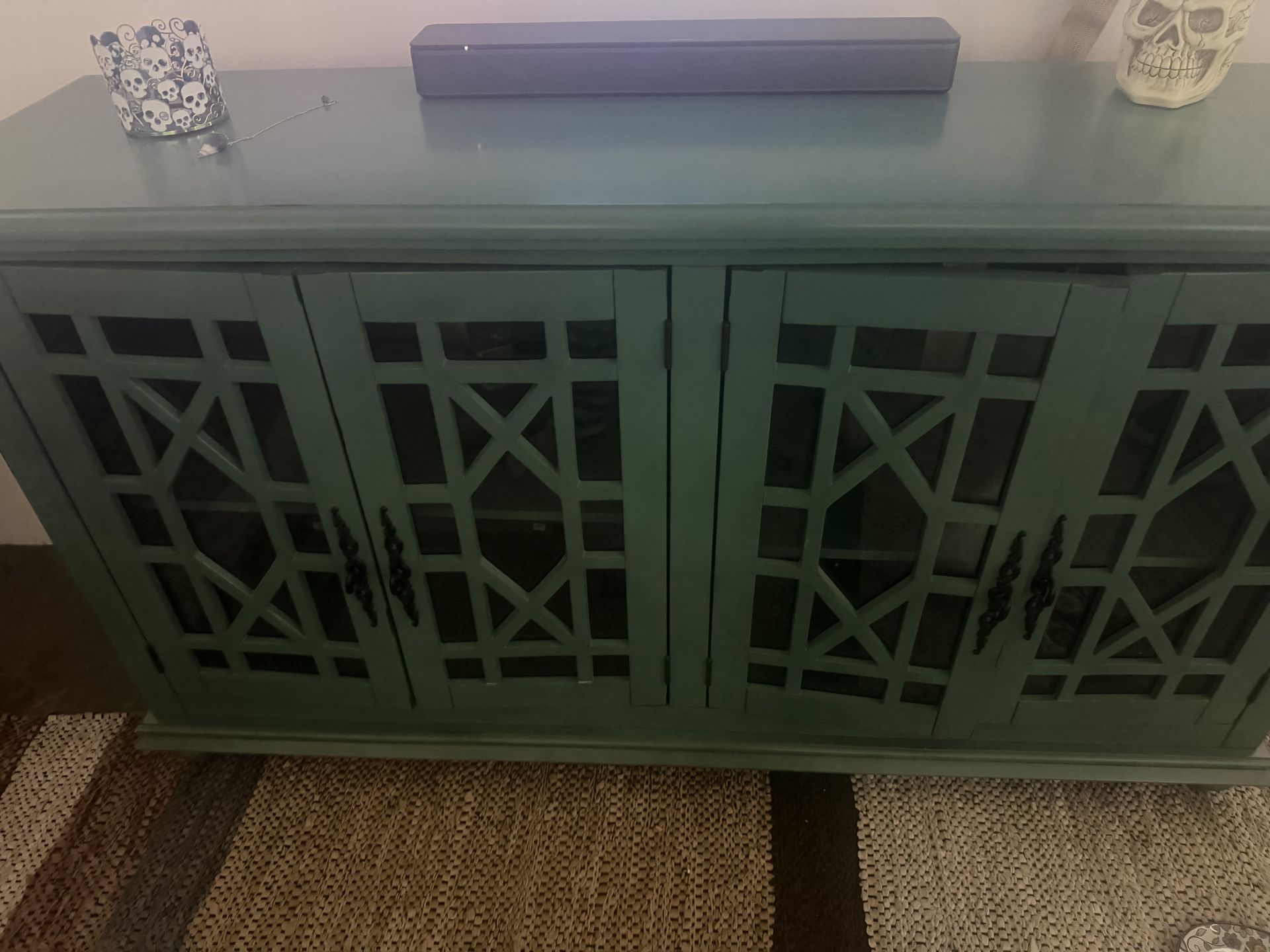 Absolutely loved this tv stand. Sturdy and beautiful. It does have a burn on the top from a candle but still great shape. It’s 63x35 and 18 in deep
