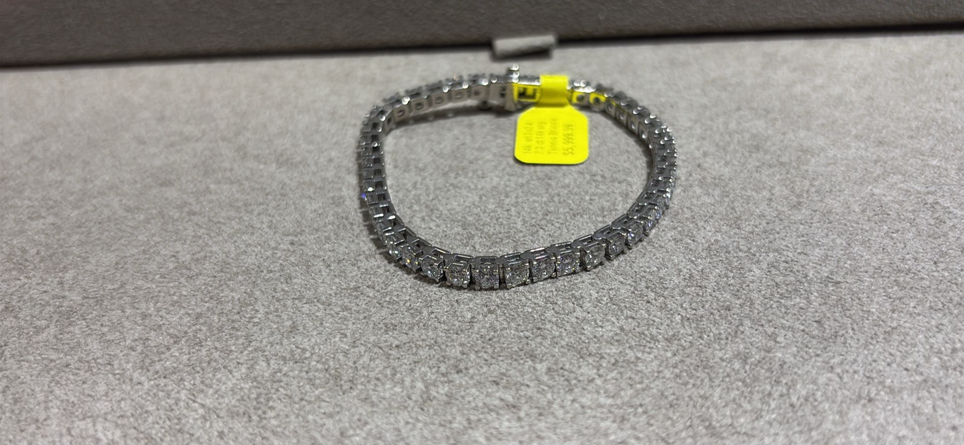 14k white gold tennis bracelet that has 43 round diamonds of 17pts Grams : 13 Carat weight of diamond : 7.3