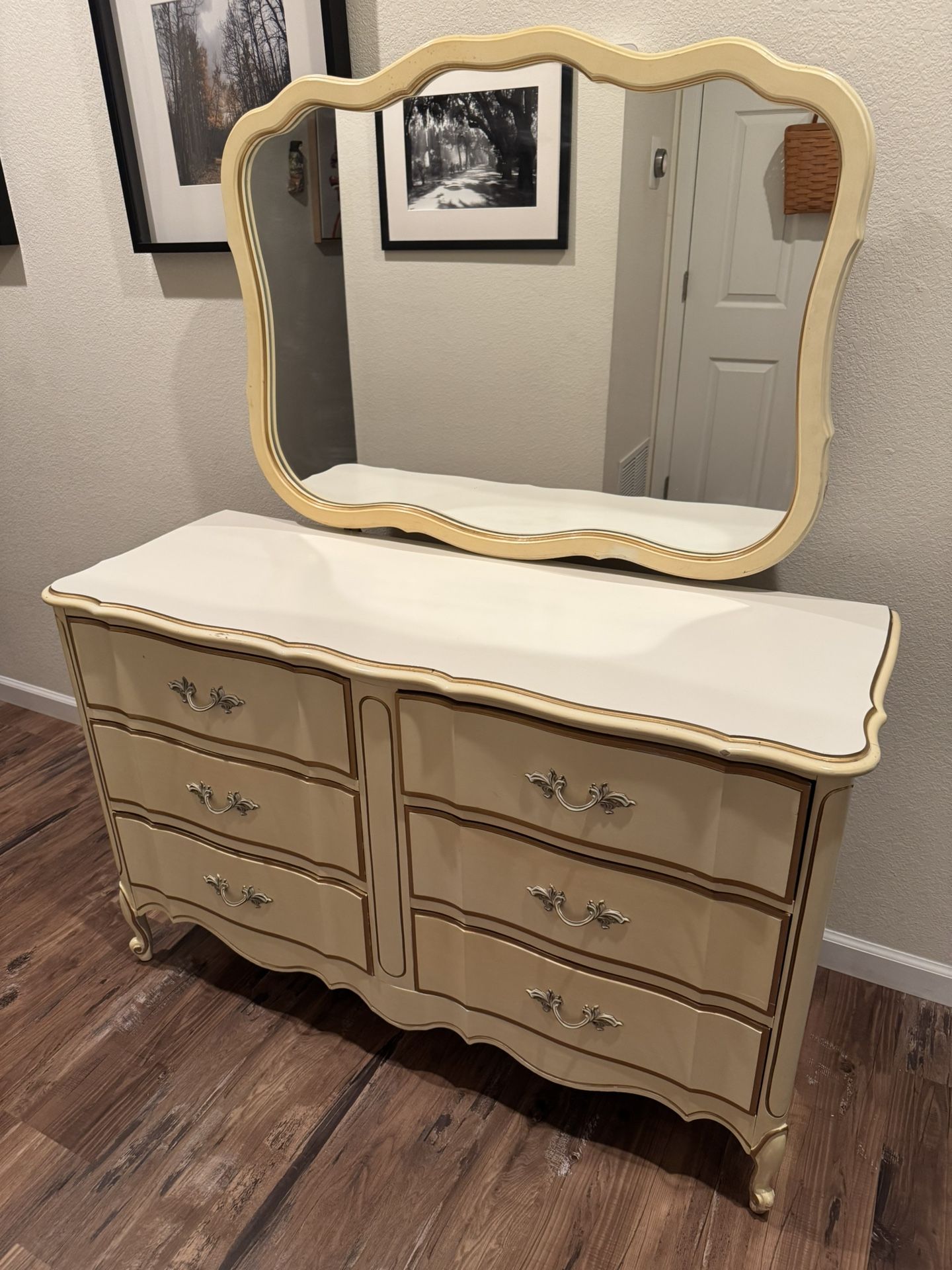 Vintage dresser with 6 drawers and rail mounted adjustable mirror. Great condition! Measurements 50”W x 19”D X 32”H (61”H including Mirror)