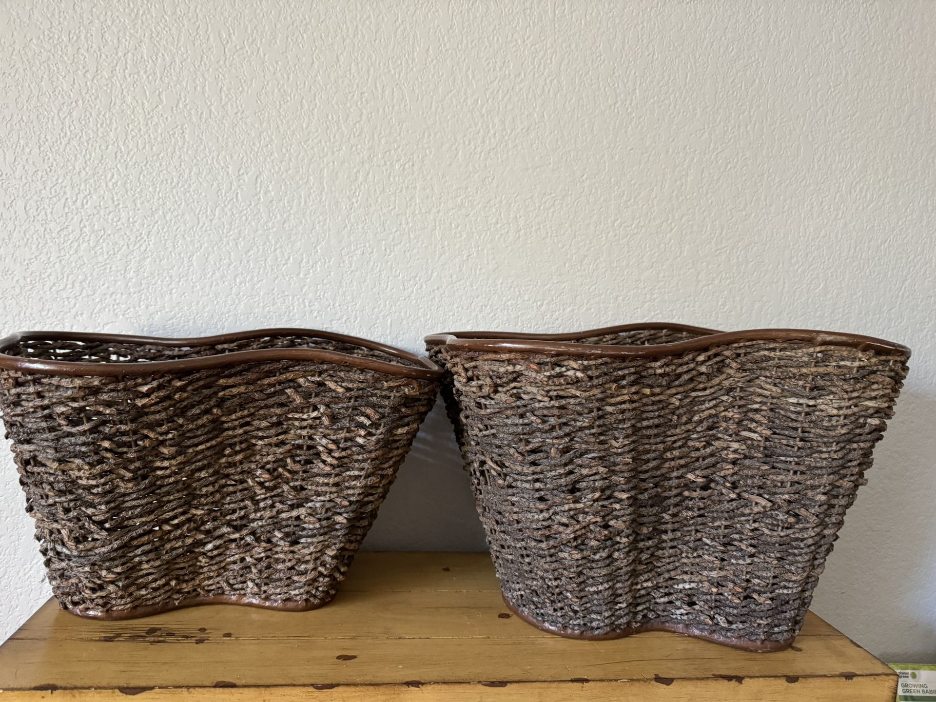 Great quality baskets that will last you a lifetime. Metal bottom and wicker like material for basket. Baskets stack and nest inside eachother.