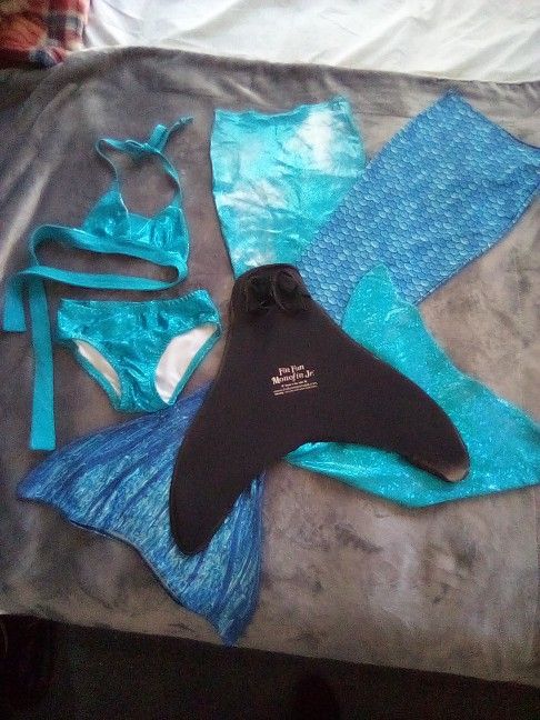 To be worn under the cloth mermaid tale. Used. Stained on one corner of the fin (years of dust?) This won't be noticeable when the 'mermaid skin' is worn over it. Plastic fin is intact. No rips, cracks, torn fabric, etc. The item is a plastic fin for swimming. Two foot holes in the fabric allow a small child to use it as a swimming device. Swim like a mermaid! Two mermaid skins from Mermaidens. One of the skins has a matching bikini top and bottom. Monofin was bleached out in an area but I've corrected it to its all black coloration. Very good used vintage condition. My daughter used the darker blue skin several times. The shiny, lighter blue tail with matching bikini has never been worn.