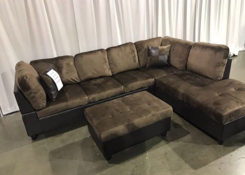 Brand New Brown Microfiber Sectional Set With Decorative Pillows & Storage Ottoman