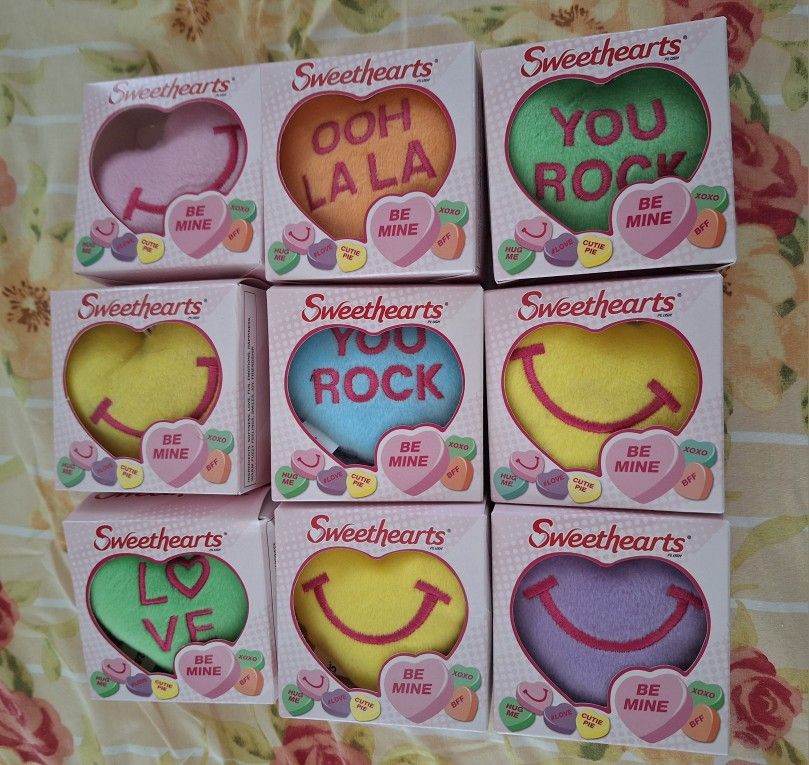 These are New in box Sweethearts Conversation Heart plush toys, specifically a set from a McDonald's Happy Meal promotion in 2015. Each heart-shaped plush features a different classic "Sweethearts" candy phrase embroidered on it. Great for you or your kids to give friends for Valentine's day! Product Details • Brand: Sweethearts (Spangler Candy Company trademark) • Retailer/Promotion: McDonald's Happy Meal toys • Year: 2015 • Material: Polyester fiberfill • Features: The plush toys come in various pastel colors and have different embroidered sayings, such as "YOU ROCK," "OOH LA LA," "LOVE," and "A SMILE". They are packaged in boxes designed to look like classic Sweethearts candy boxes. • Collectibility: These are considered collectible items • Size: These generally measure between 4-5 inches.