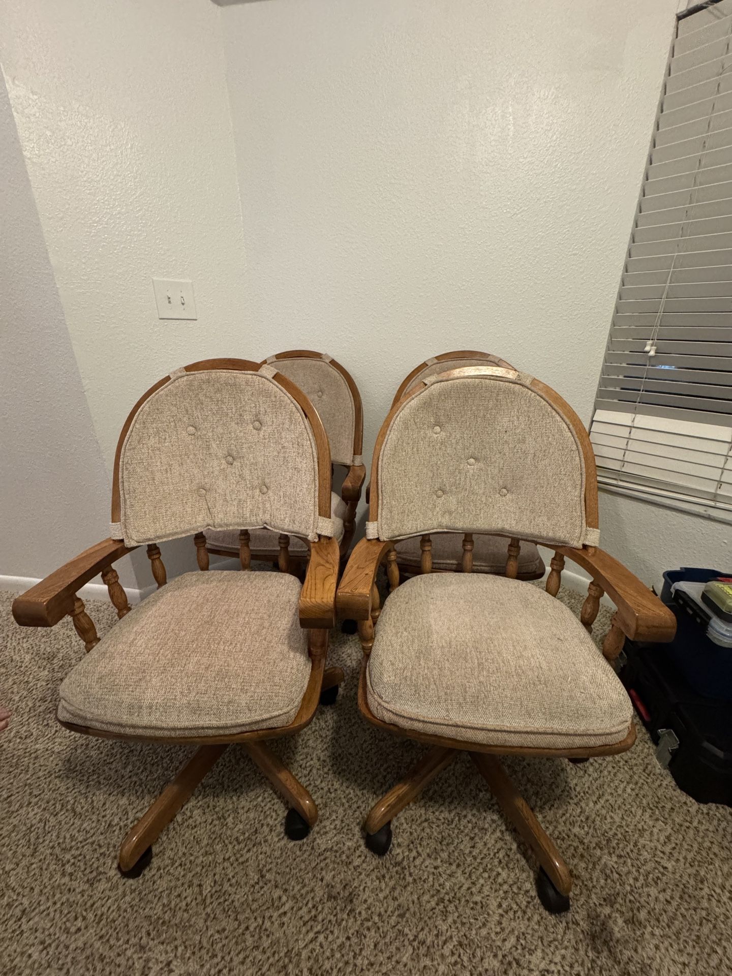 Great condition Solid oak design Fully padded seat and back with a swivel-tilt mechanism and smooth casters Measurements: 24 " wide 19 " deep 41 " high Intercon Classic Oak Swivel Tilt Caster Chair, Set Of 4