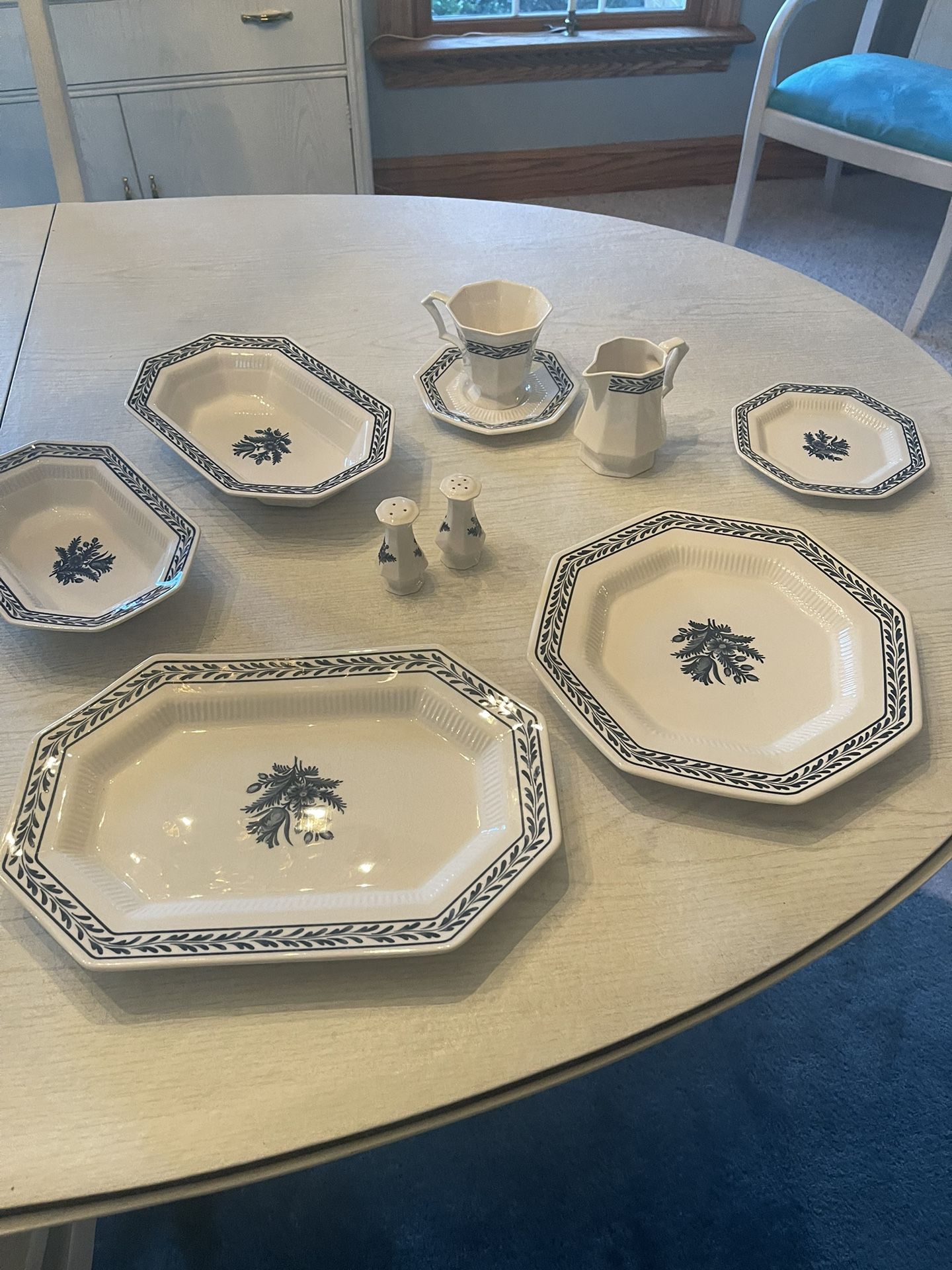 Each 8 piece set is $40. Has sugar, creamer.For extra $10, the one with green border is 16 pieces with bowls, creamer and sugar