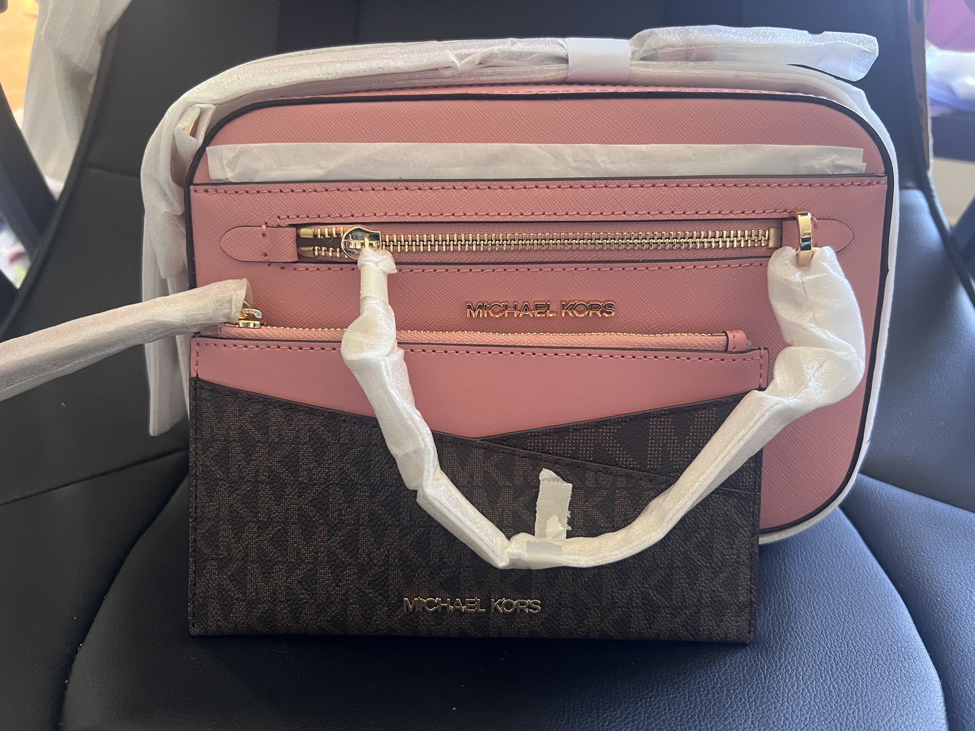 NWT Pink Jet Set Purse And NWT Jet Set Travel MD Wallet -multiple outdoes/inside drop pockets on purse -MSRP $348 -Inside zip pocket -crossbody -opened only for these pics -if interested-I can mail in an MK box with tissue paper and bow for an extra $15 -wallet has outside pocket -never been taken out of plastic prior to these pics -Perfect matching pink colors (wallet/purse) -inside has 3 cc slots and MK care card