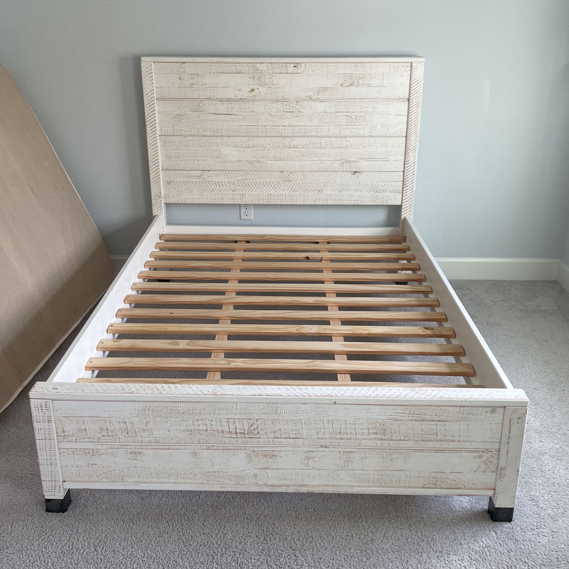 Full Size bed. White/Brown with metal feet. Includes frame and backboard Measurement 79 L x 56 W x 17 H (inches) Backboard 58 W x 49.5 H (inches)