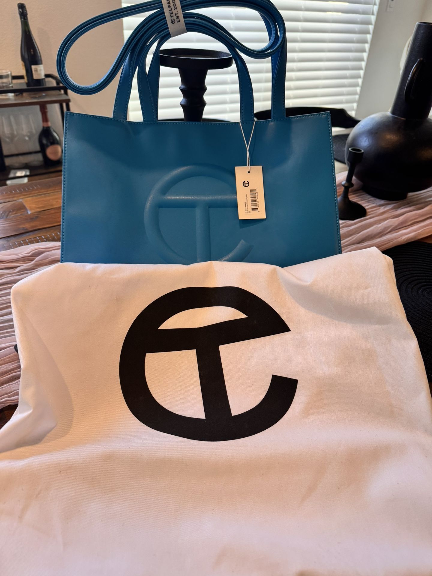 Beautiful Telfar Bag in color Cyan. It’s sold with dust bag and ALL tags. Brand new never worn and dust bag has no smell. NWT