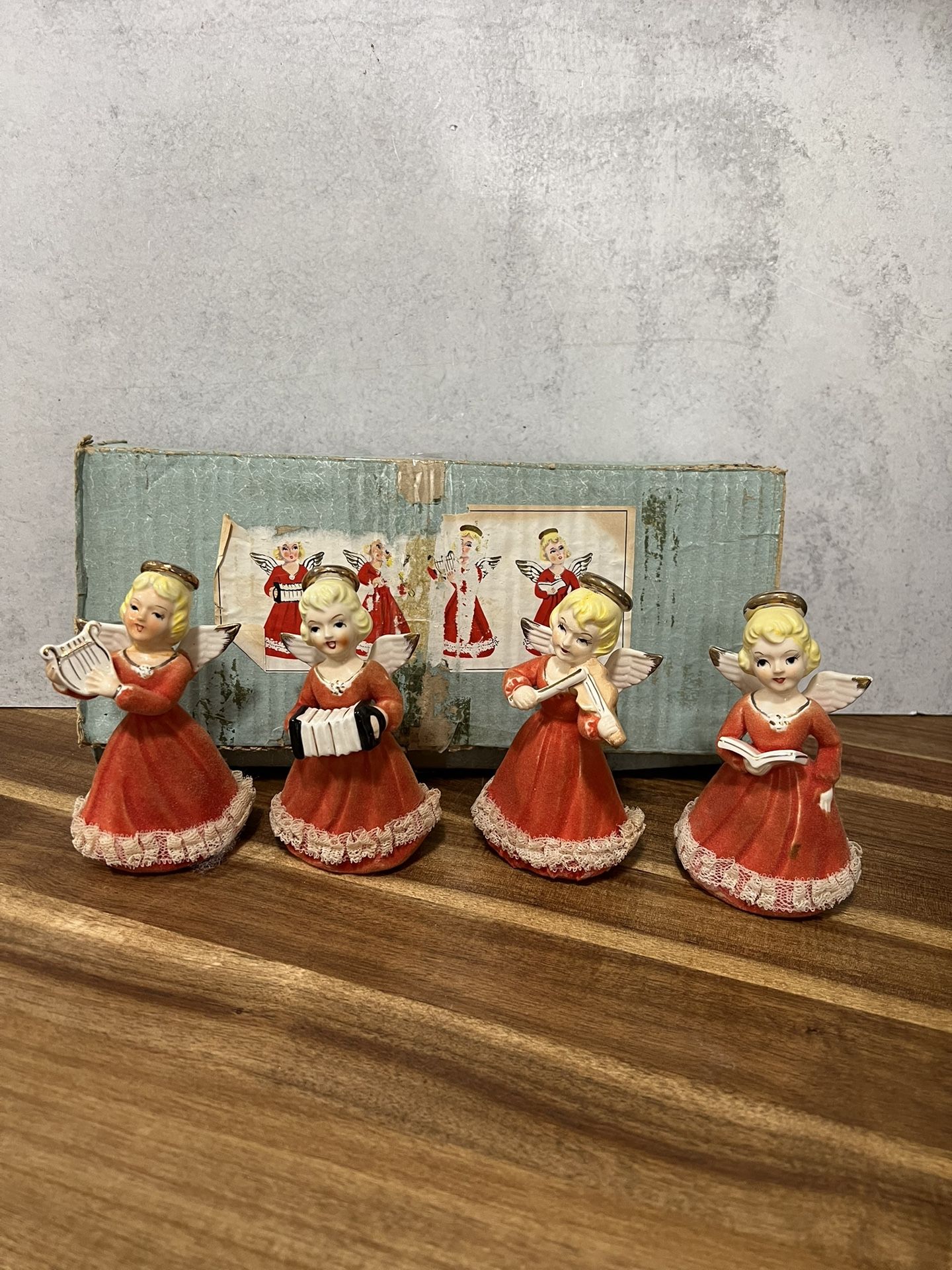 Vintage Set Of 4 Christmas Angel Musicians Or Figurines Red Flocked Japan