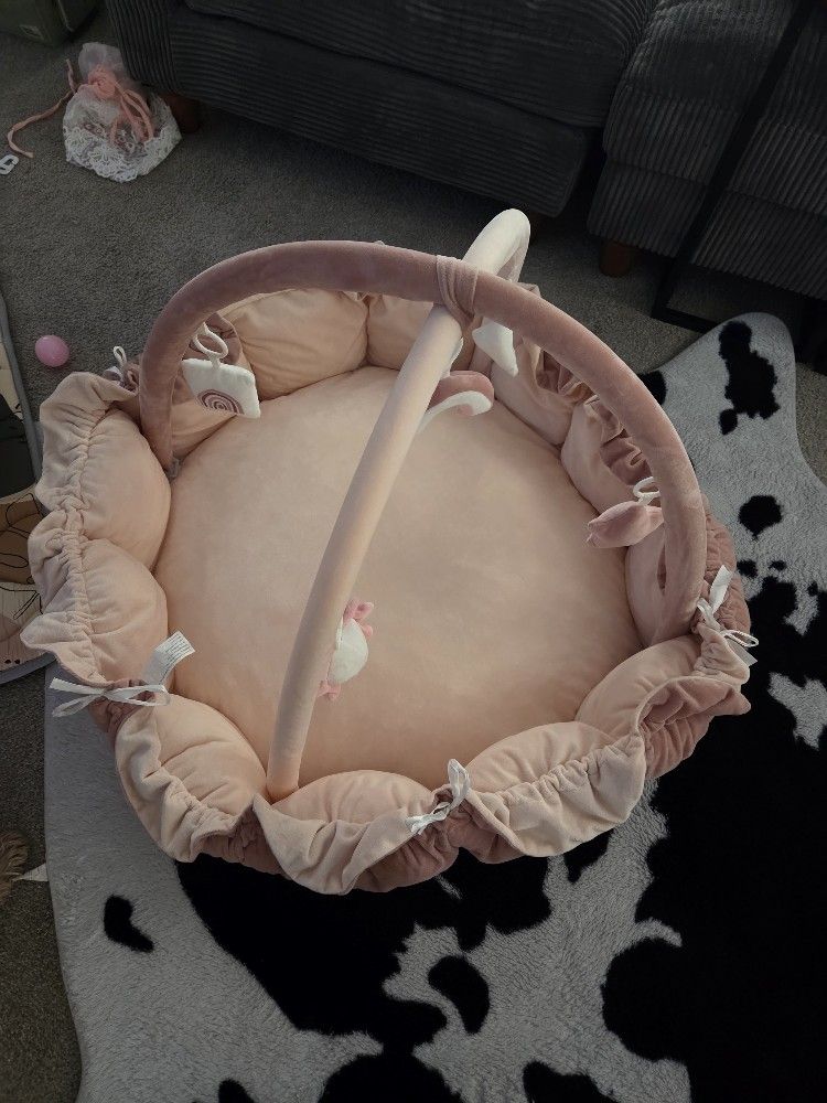 This 5 in 1 playmat is so soft and plush. Converts to a ball pit, baby bed, lay down playyard, sit up playyard, flat blanket. Has toy arches included