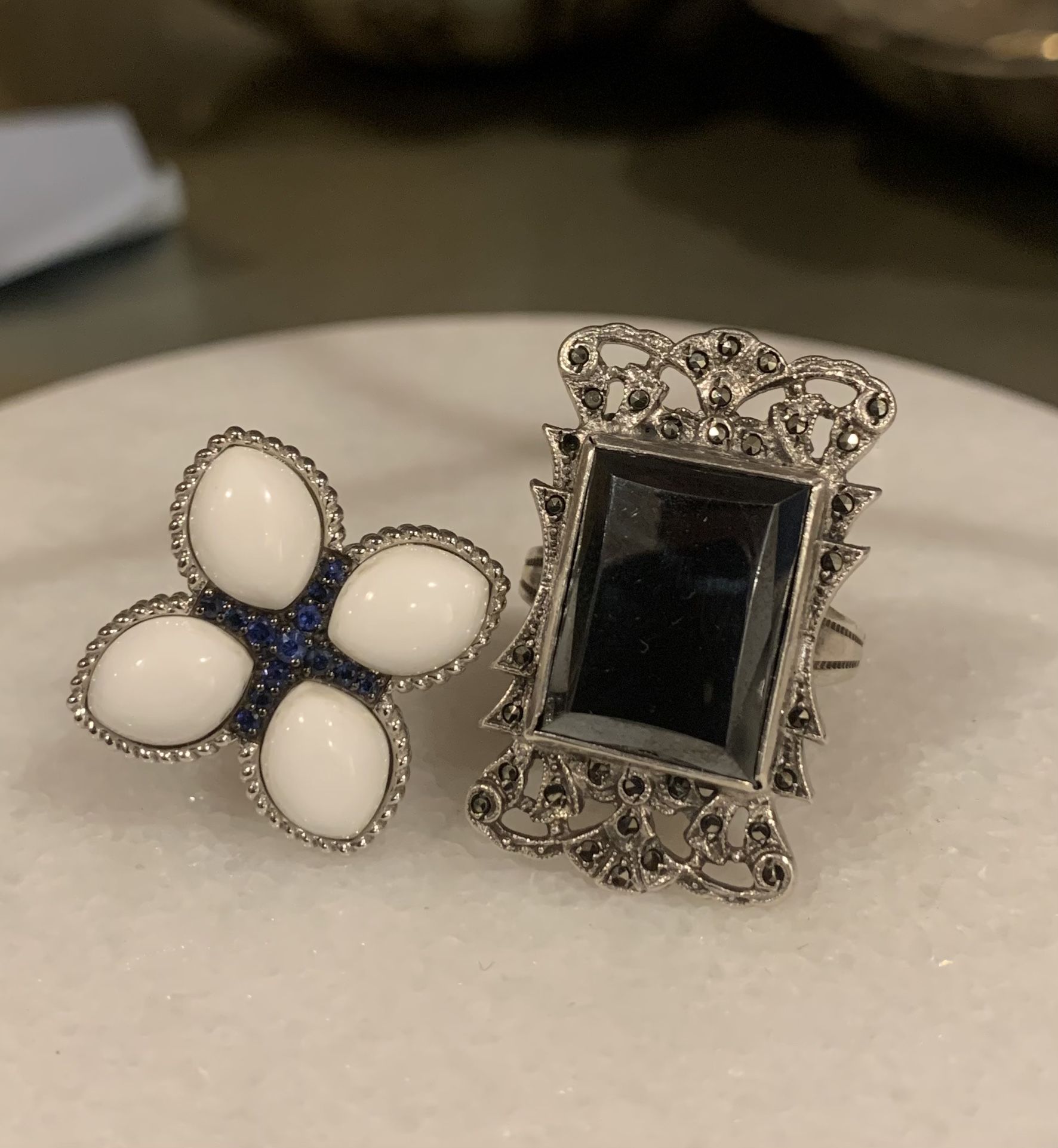2 heavy sterling silver rings. One with hematite and marcasite, the other unknown; black is size 8.5, and white is size 6 If interested in one individually, let me know! I have other gold and silver jewelry listed as well