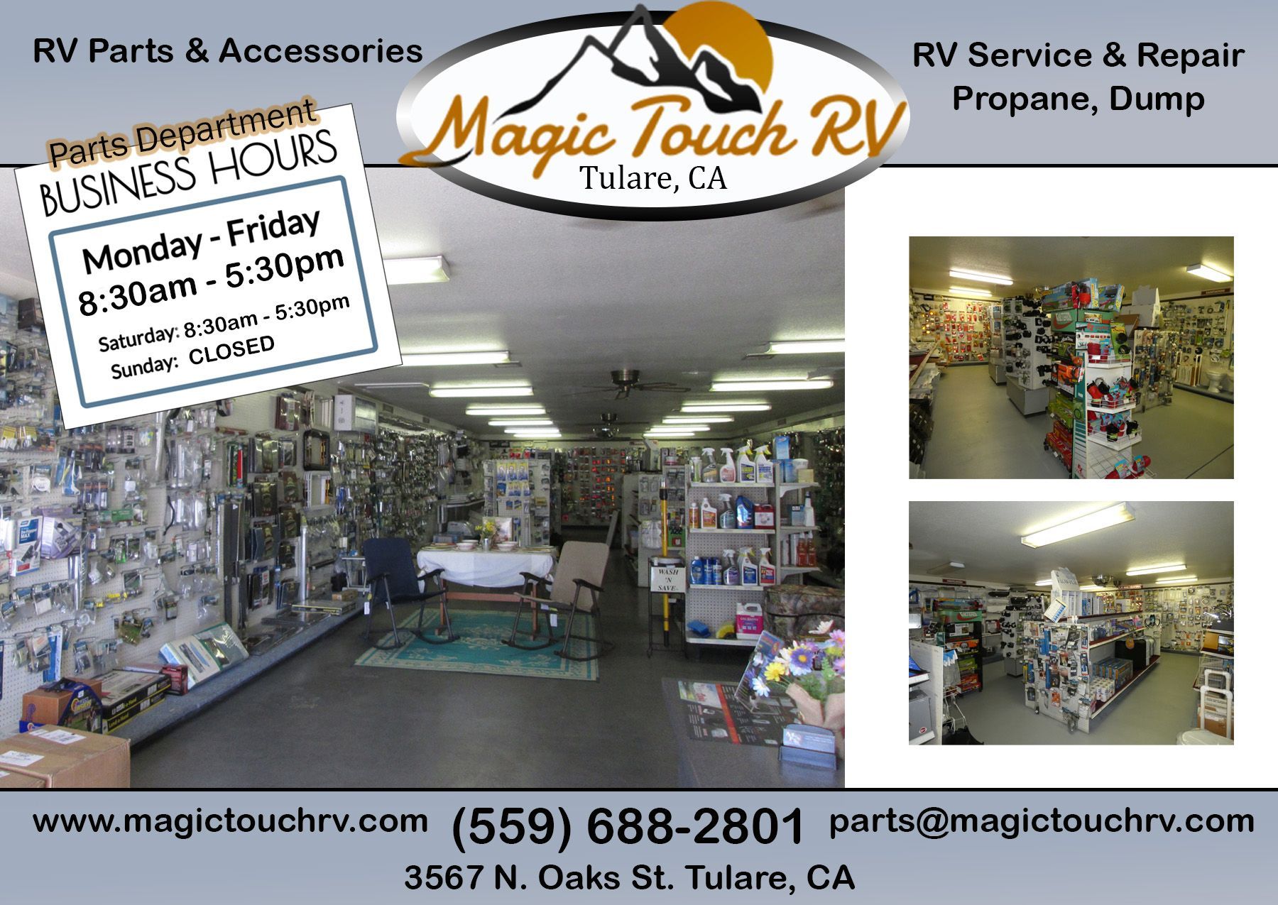 Looking for RV Parts & Accessories? Look No Further! We have an extensive collection of new and used RV parts and accessories, catering to a variety of makes and models for your motorhome, travel trailer, fifth wheel or toy hauler. Hard to find parts? We have a large selection of specialty parts that are often difficult to locate elsewhere. Awnings RV furniture hitch & receivers generators plumbing vents entry doors compartment doors electrical and 12volt refrigeration air conditioners Much More! View our RV Parts Catalog online: https://www.magictouchrv.com/rv-service-parts (Click Parts Brochure link) Give us a call or come by and see our well stocked Parts Department. Magic Touch RV 3567 N Oaks St Tulare CA 93274 (559) 688-2801 Parts Department hours: M-F 8:30am - 5:30pm Sat 8:30am - 5pm Sunday Closed