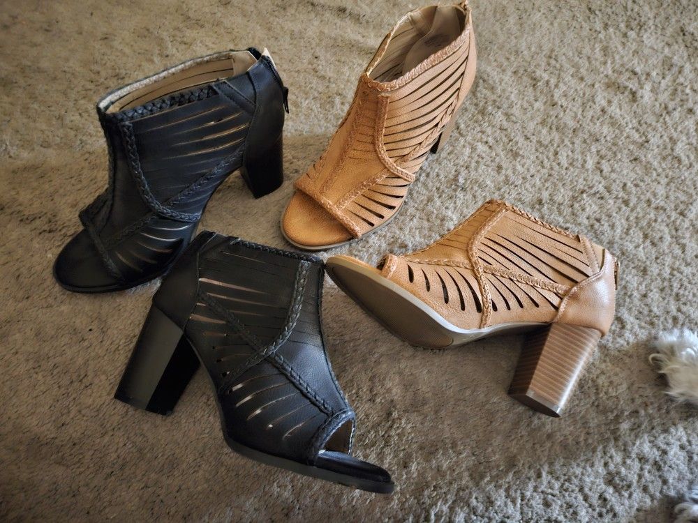 Size 8.5 open toe booties but fit like 9.5 because they run big. Never worn the brown one's but worn the black once. 20$ each.