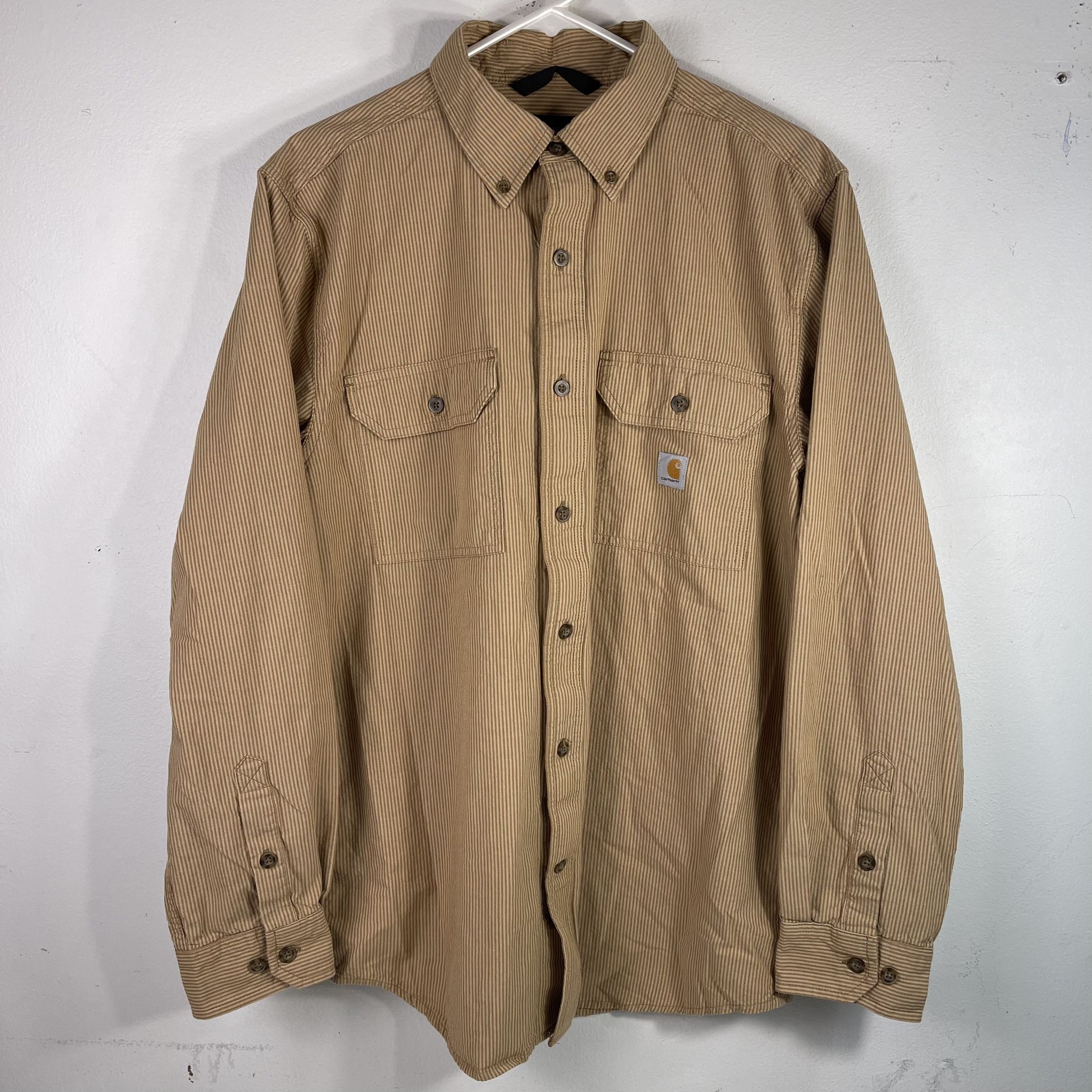 Tan Carhartt pinstripe button down shirt excellent condition (no stains or rips) mens size medium ( more like a fitted large) Hard to find